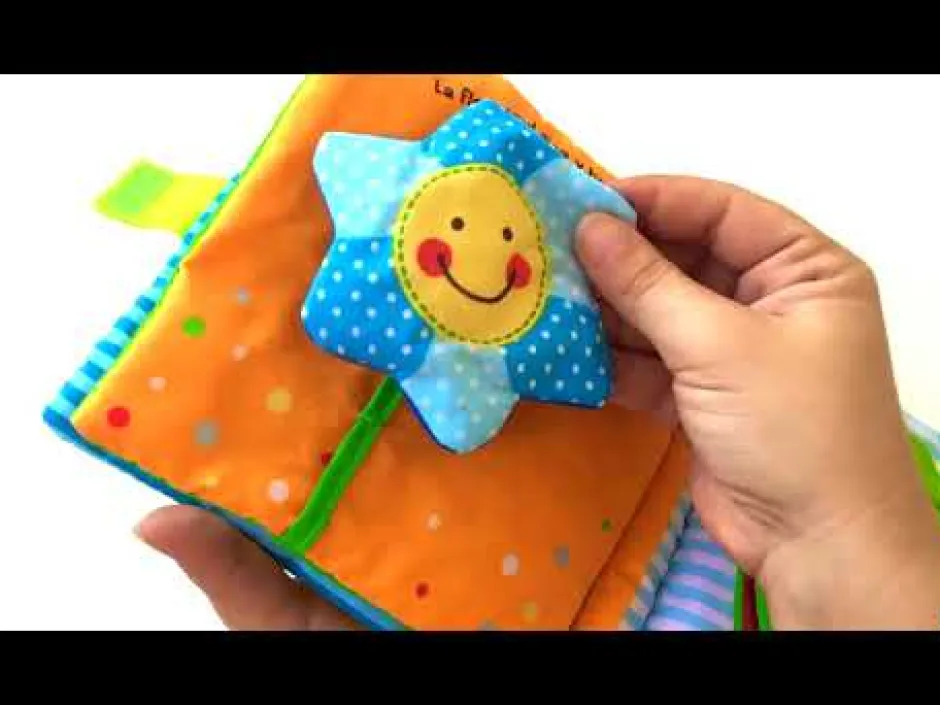 Un libro de tela de formato grande y colores vivos con varias texturas para agarrar, elementos sonoros y un pequeño espejo al final para estimular el juego del bebé. ¡Un regalo ideal para los más pequeños!