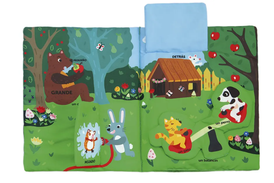Un libro de tela de gran formato sobre los conceptos básicos (formas, colores, contrarios y números) con animadas escenas protagonizadas por animales. Con solapas para levantar, efectos sonoros, papel crujiente y objetos móviles, contiene más de diez elementos pop-up de tela pensados para la estimulación temprana de los bebés.