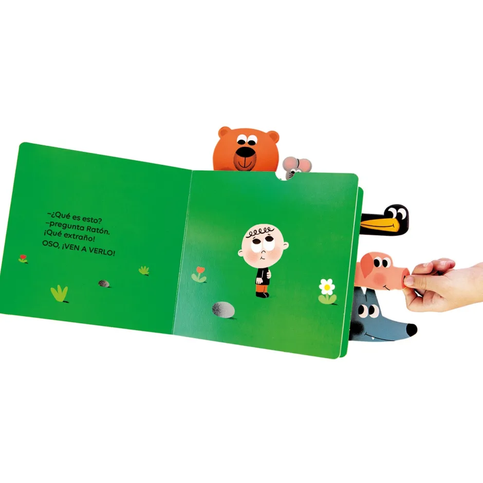 Eh, amigos, ¡venid a verlo! ¿Qué es esto? ¡Qué extraño!» Un libro animado y con lengüetas para tirar con el que los niños y las niñas se divertirán para hacer aparecer los animales en cada doble página.