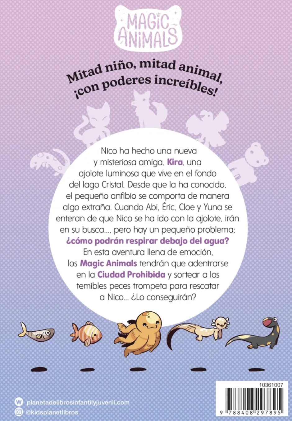 Nico ha hecho una nueva y misteriosa amiga, Kira, una ajolote luminosa que vive en el fondo del lago Cristal. Desde que la ha conocido, el pequeño anfibio se comporta de manera algo extraña. Cuando Abi, Éric, Cloe y Yuna se enteran de que Nico se ha ido con la ajolote, irán en su busca… pero hay un pequeño problema: ¿cómo podrán respirar debajo del agua? En esta aventura llena de adrenalina, los Magic Animals tendrán que adentrarse en la Ciudad Prohibida y sortear a los temibles peces trompeta para rescatar a Nico… ¿lo conseguirán?