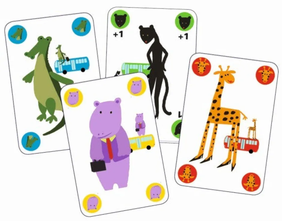 Encontraremos cartas básicas, que muestran animales, autobuses al fondo y círculos del mismo color que el autobús en las esquinas, y también cartas especiales que introducirán acciones adicionales como saltarle el turno a un jugador, cambiar la dirección del juego, hacer robar cartas a los demás jugadores, usar como comodín, o el temible gorila que hará que el último jugador en poner la mano sobre dicha carta tenga que llevarse 3 cartas como penalización, todo para conseguir ser el primer jugador en quedarse sin cartas en la mano.