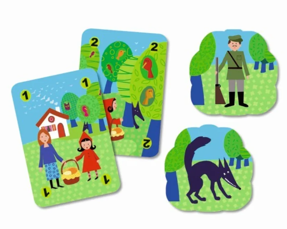 Un juego de estrategia inspirado en el cuento de Caperucita roja. Los niños disfrutarán encontrando los personajes de esta famosa historia. Gracias a sus propias cartas o a las de otros jugadores, que puede robar con el lobo, un jugador gana la partida cuando es el primero en reunir las 6 cartas que forman el cuento.