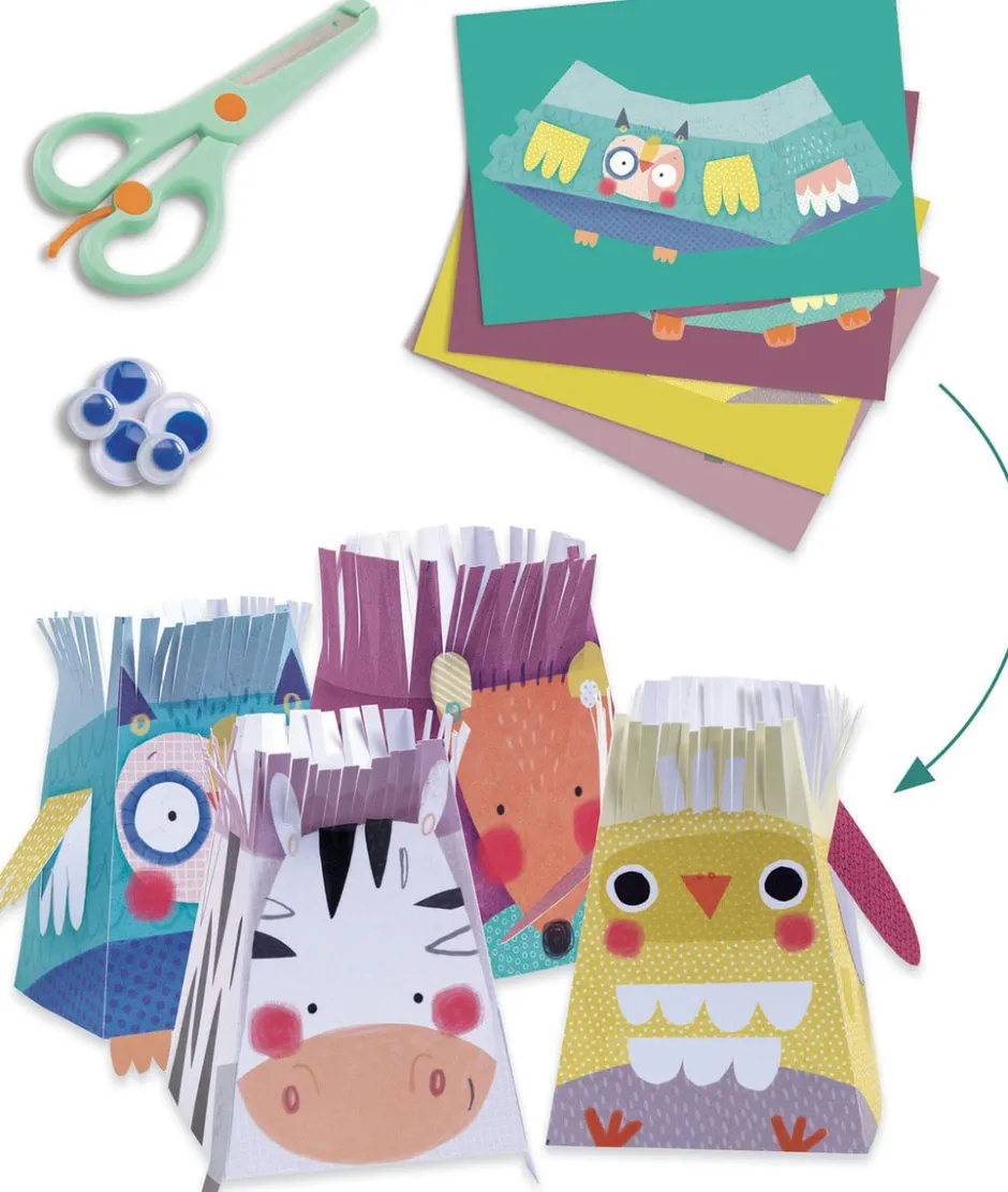 - Recortes: 4 hojas ilustradas (21 x 28 cm), 1 par de tijeras de seguridad, 8 ojos móviles.