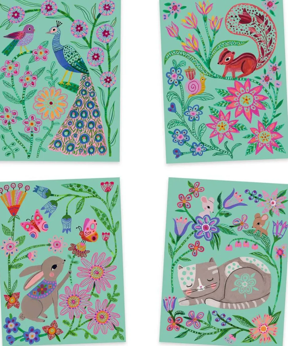 Un estuche de 4 tarjetas para rascar con adorables ilustraciones: los animales del jardín se encuentran en una decoración floral. El niño reproduce los dibujos imaginados por el artista raspando la superficie con el punzón