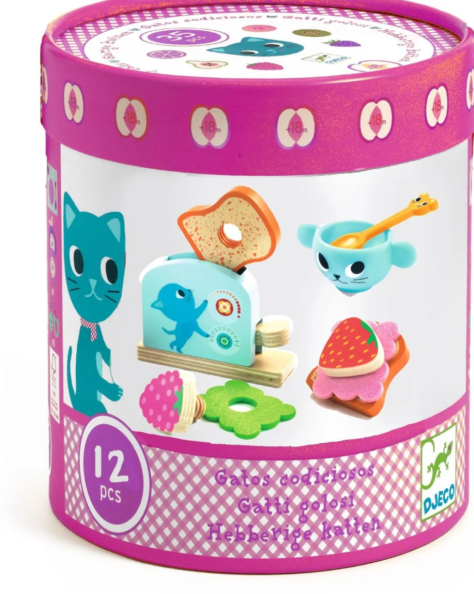En una hermosa caja cilíndrica, se incluyen todos los accesorios necesarios para preparar un delicioso desayuno. El manejo de las piezas promete un rico aprendizaje de las formas, los colores y la destreza necesaria para organizar una comida.