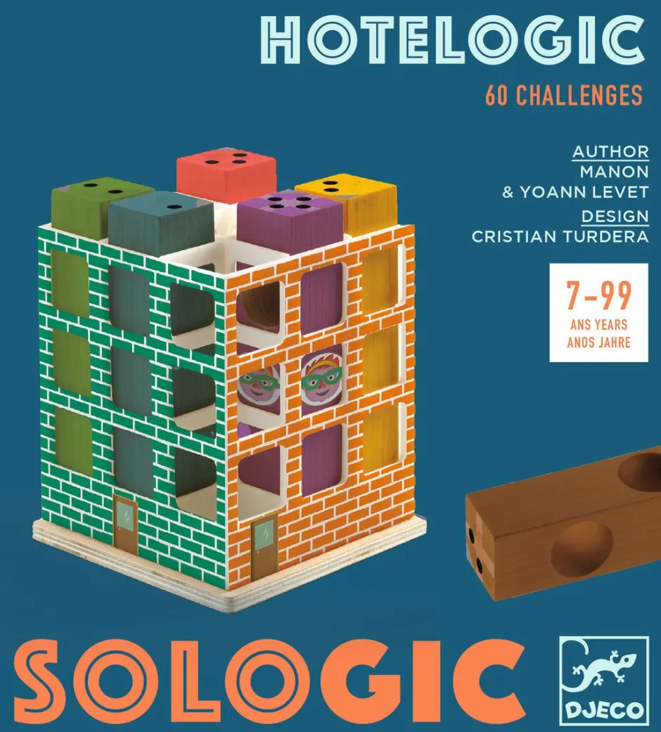 ¡Bienvenidos al mejor hotel del mundo! Observa las tarjetas de desafío y los clientes que aparecen en ellas: deberás acomodarlos en la habitación que se indica, combinando las piezas en el tablero para que cada uno esté en la habitación escogida, ¡todo un reto para tus neuronas!