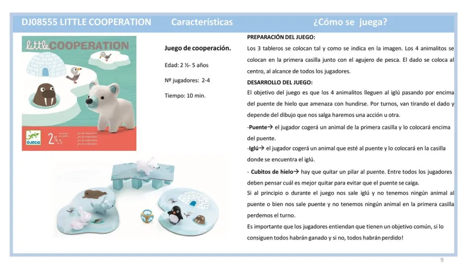 En el banco de hielo, 4 animalitos tratan de llegar a su iglú. Tendrán que hacerlo con precaución ya que el puente de hielo amenaza con hundirse. Un juego que requiere cooperación para aprender a jugar y ganar todos juntos.