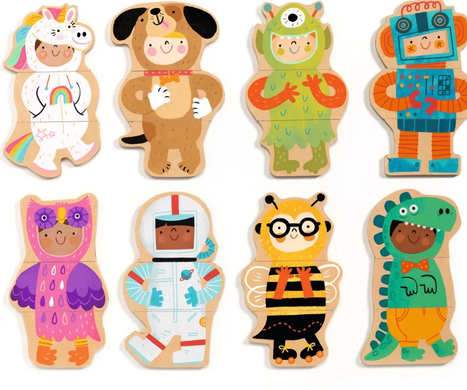 Caja de 24 piezas magnéticas de madera para formar niños disfrazados o imaginar otros más divertidos. ¡El niño ayuda al cosmonauta a recuperar su cuerpo y sus piernas!