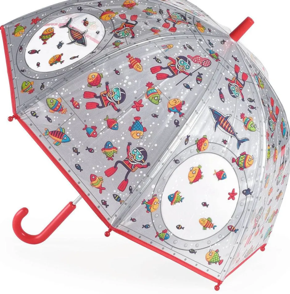 ¡Un paraguas moderno y práctico con detalles submarinos y un mundo submarino para descubrir a través de los ojos de buey! Apertura manual, con sistema de seguridad para que los niños puedan abrir y cerrar sin pillarse los dedos..