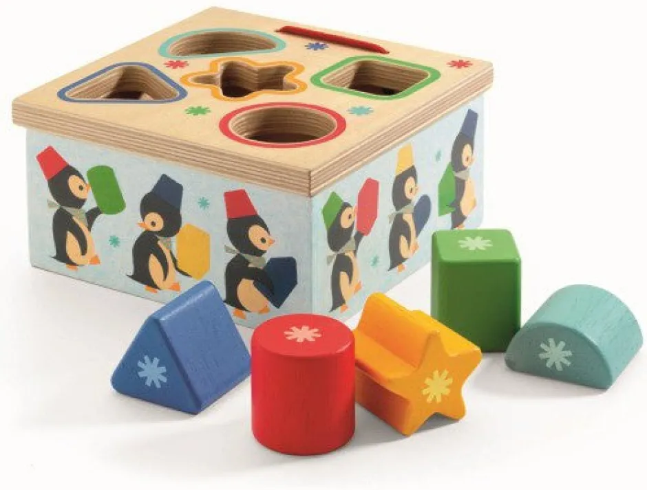 Una caja de madera cuadrada decorada con pequeños pingüinos. Consta de 5 piezas de diferentes colores y formas que se introducen en la caja. El niño desliza las formas en los orificios correspondientes, guiado por la forma de la pieza, así como por su color. Una vez terminado, abre la tapa y recoge las piezas.