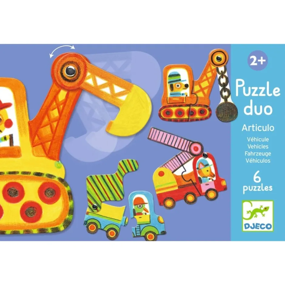 Puzzle duo Articulo Véhicules consta de 6 puzles de vehículos de colores articulados. Una vez armados, el niño podrá jugar con estos e imaginar historias.