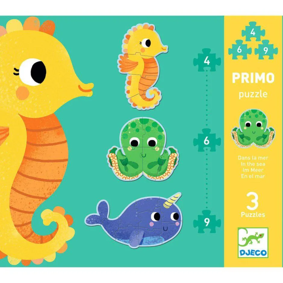 Este estuche contiene 3 puzles evolutivos de siluetas de dificultad creciente sobre el tema de los animales del mar. Un caballito de mar de 4 piezas, un pulpo de 6 piezas y una ballena de 9 piezas.