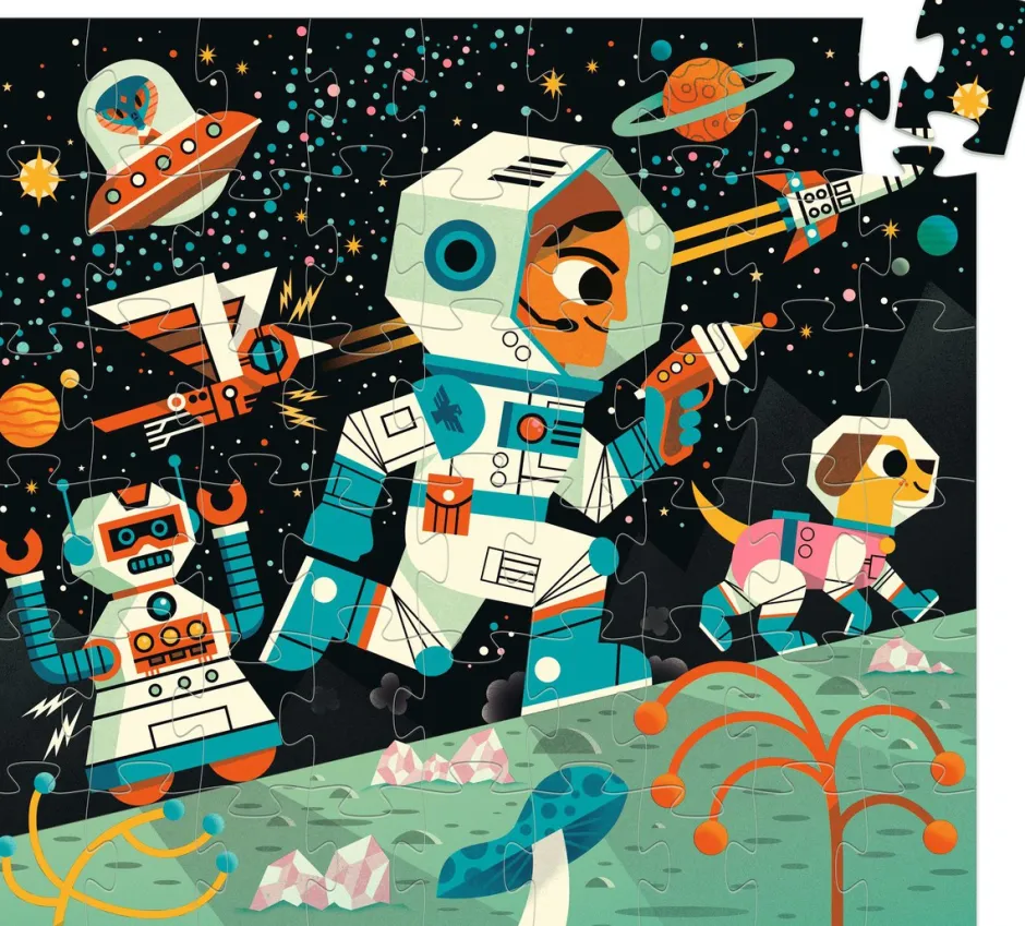 El niño arma un puzle con forma de cenefa para descubrir una estación espacial. Este magnífico puzle de 54 piezas se presenta en una bonita caja con silueta.