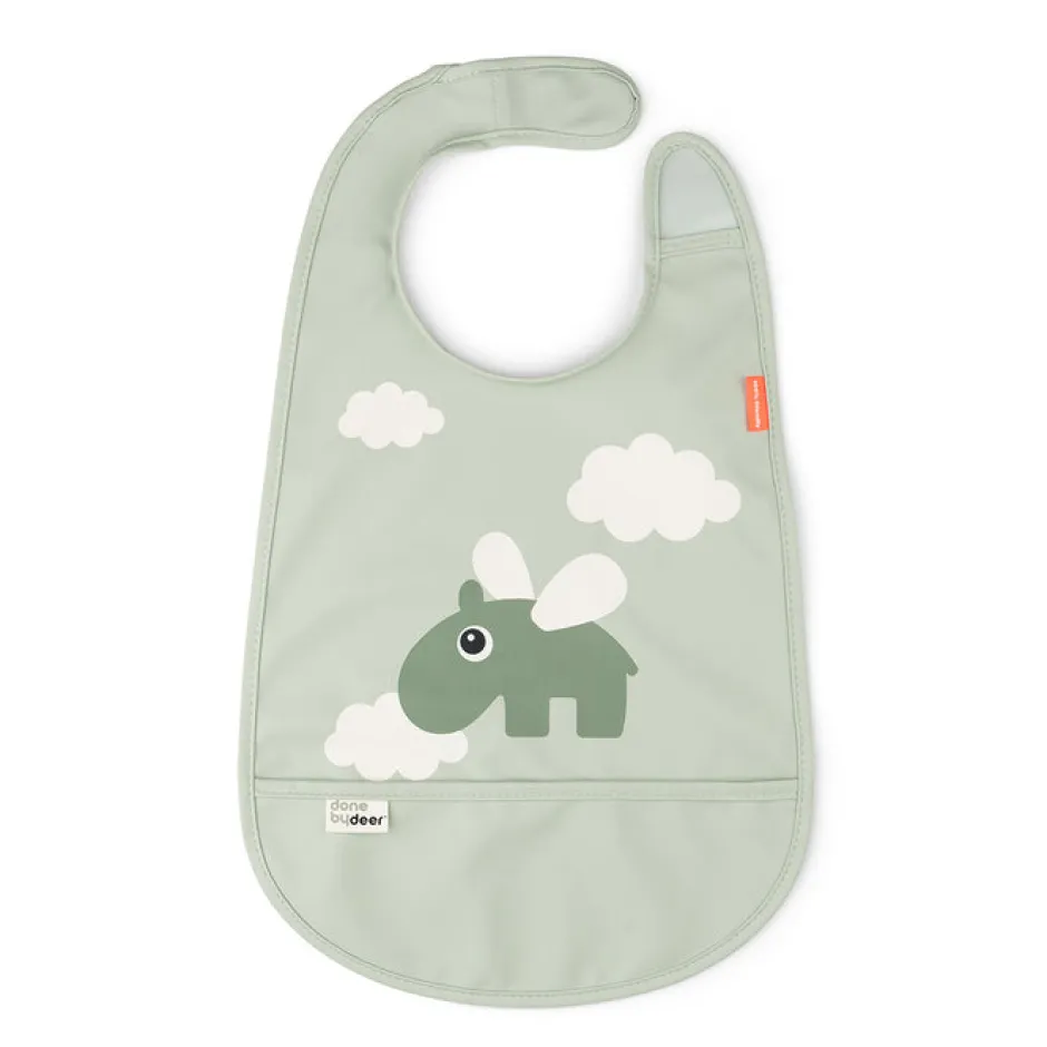 Babero con cierre de velcro en cuello. Con un bolsillo recogemigas para evitar que caiga la comida o la bebida a la ropa.