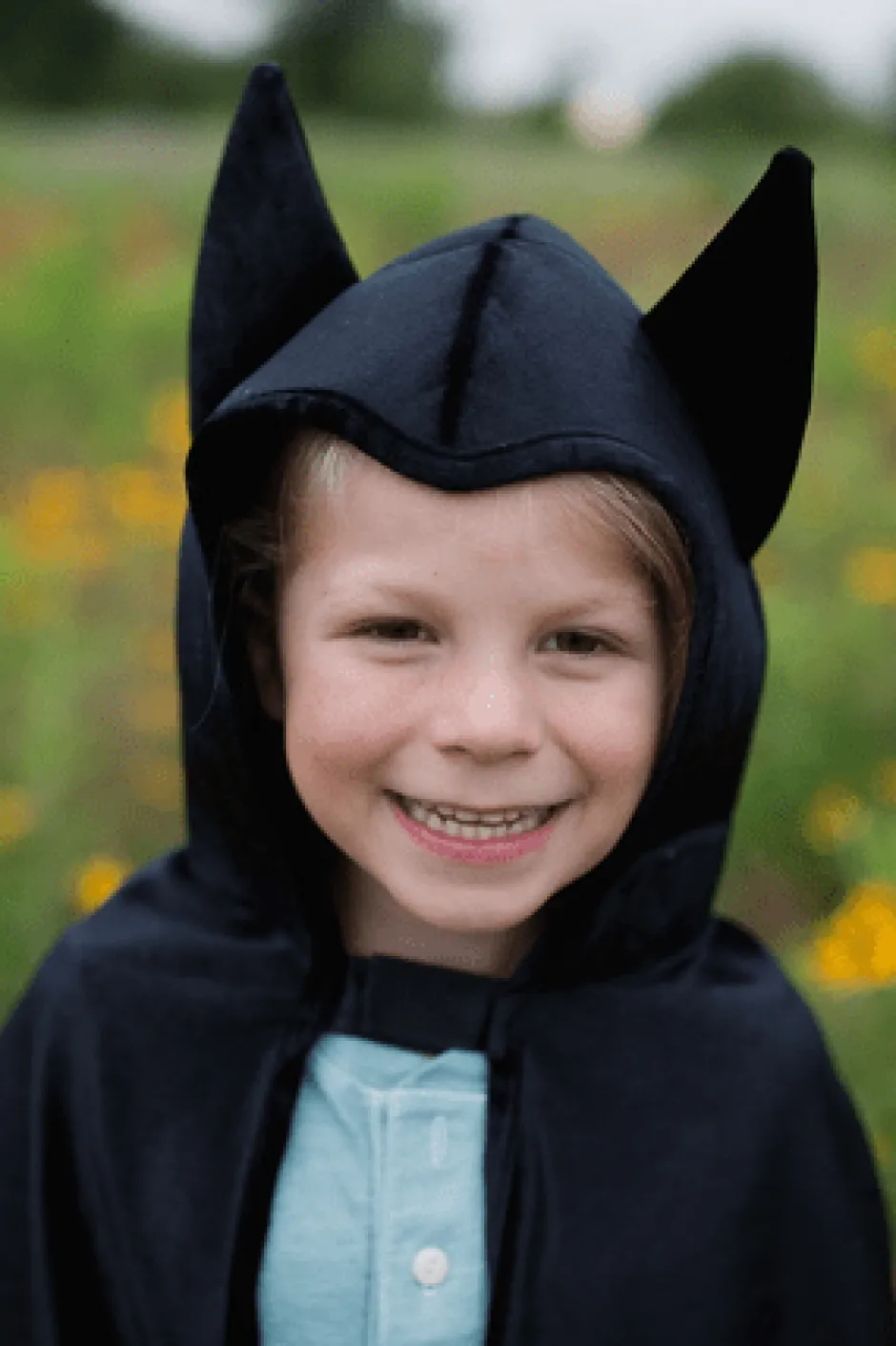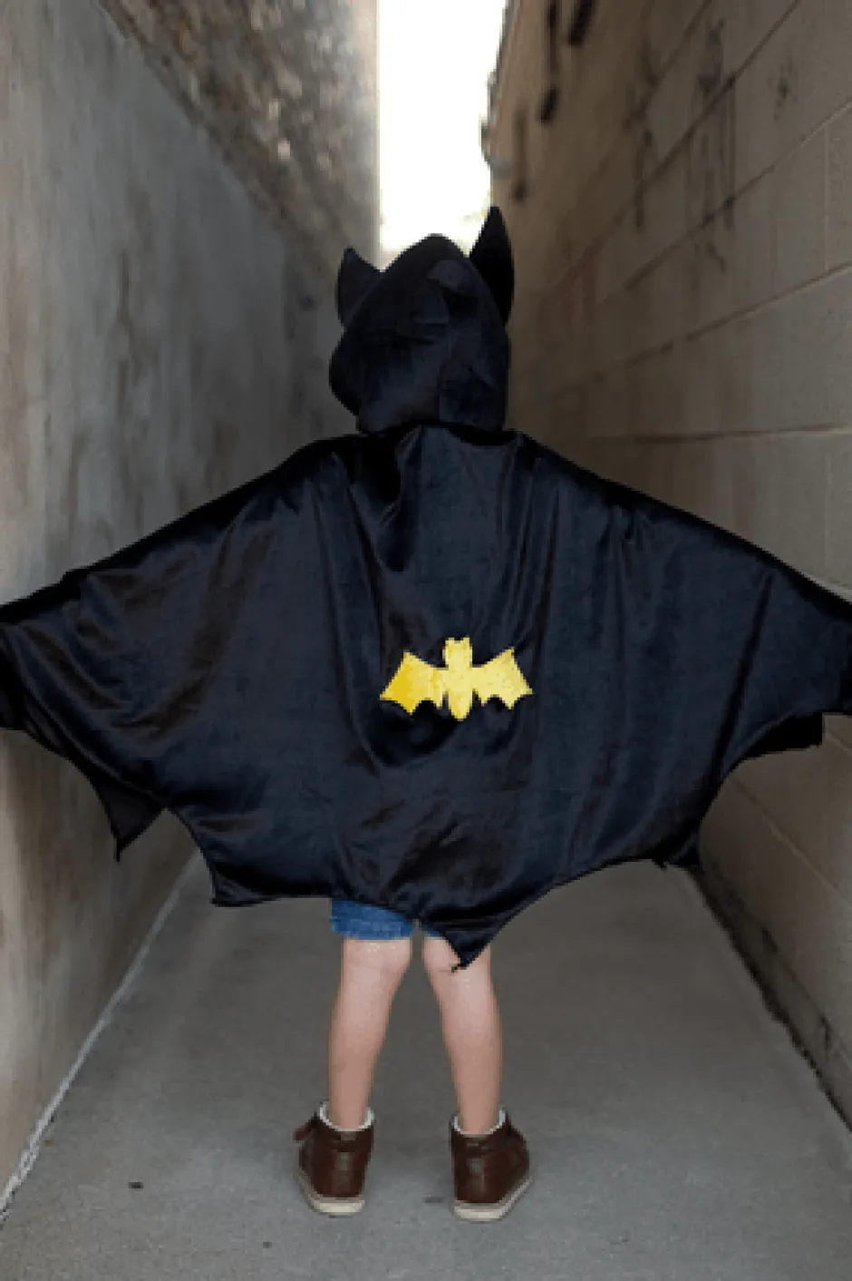 ¡Listos fans de los superhéroes! Esta capa de murciélago con capucha presenta grandes orejas de murciélago en la capucha y un impresionante emblema de murciélago en la parte posterior de la capa. La capa está hecha de tela de terciopelo suave y está cortada como las alas de un murciélago real.