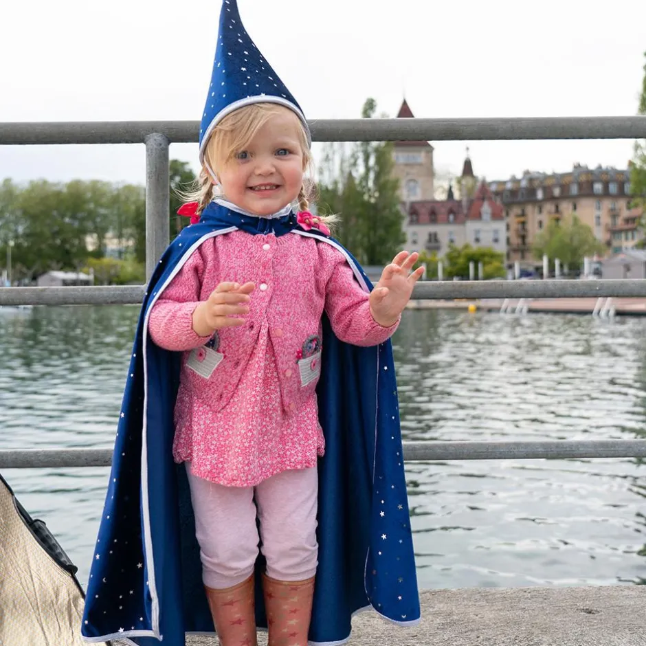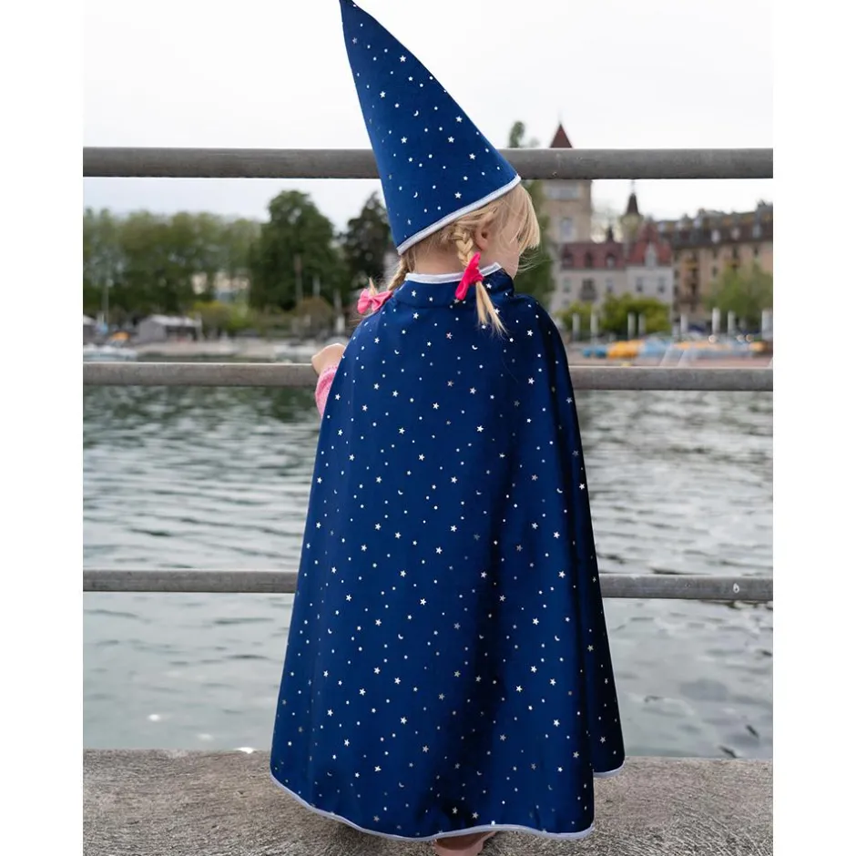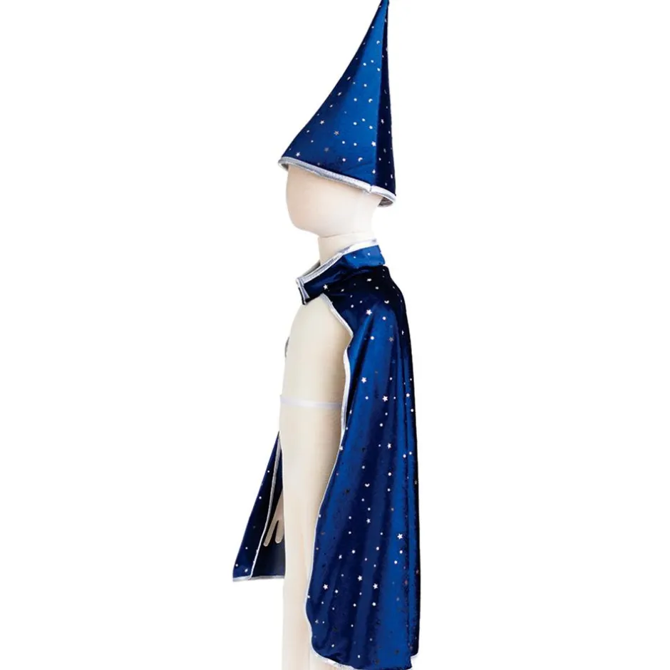Con estrellas y lunas estampadas con purpurina plateada sobre un terciopelo azul medianoche intenso. Este conjunto de 2 piezas incluye un sombrero de mago puntiagudo con una correa elástica para la barbilla y una capa para una apariencia completa y mágica. Capa con cierre de velcro para ponérsela y quitársela fácilmente.
