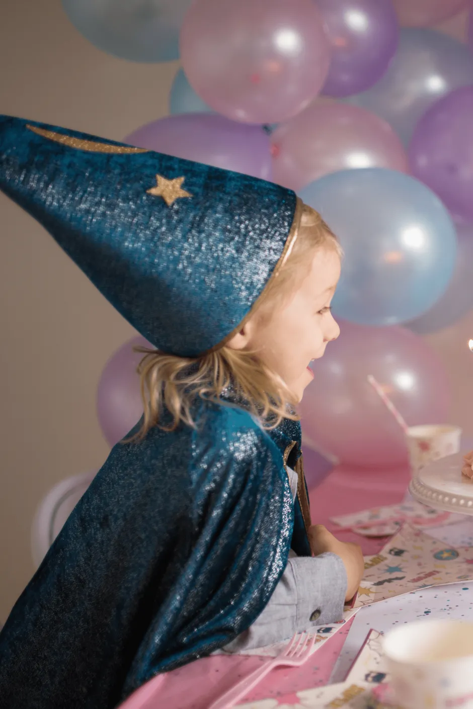 ¡Esta capa y sombrero de mago de primera calidad seguramente te hechice! Suave y cómoda, diseñada para parecerse al misterioso cielo de medianoche con dibujos de estrellas y lunas, ¡esta es la capa perfecta para fomentar el juego creativo todos los días!