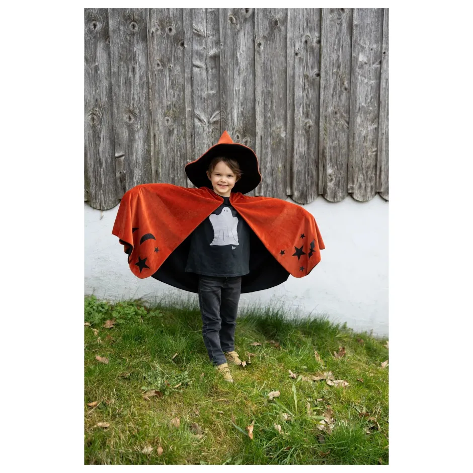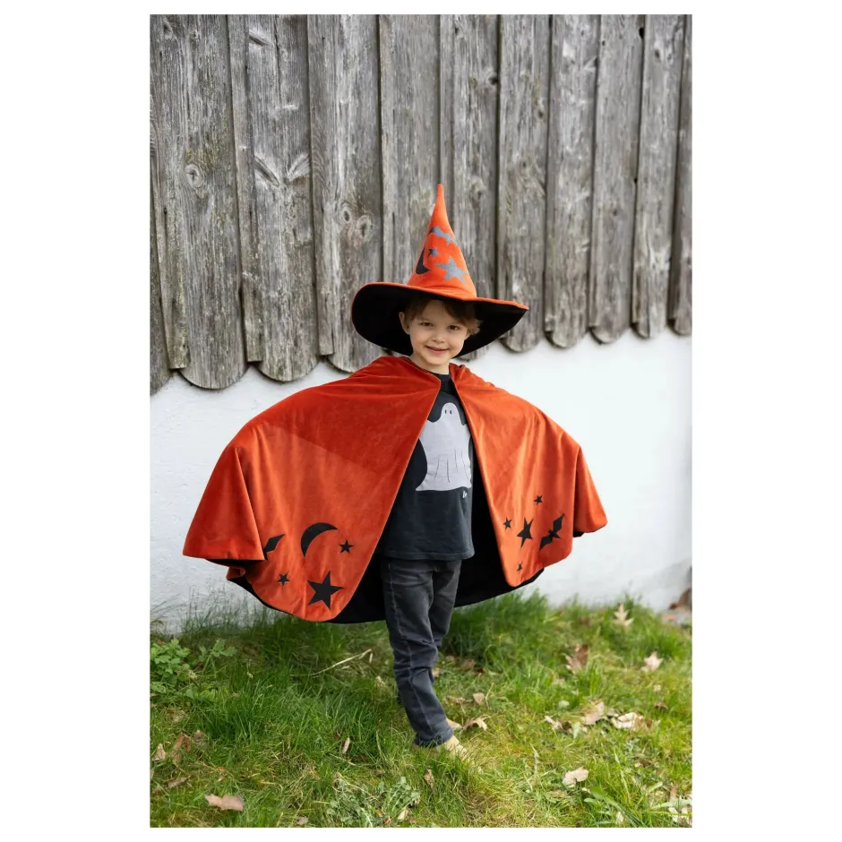 Conjunto de capa y sombrero de mago en tonos otoñales, perfecto para niños que quieren vivir aventuras mágicas con estilo y calidez.