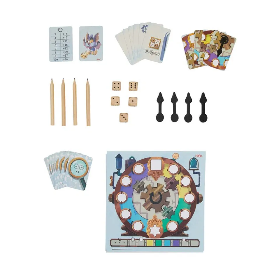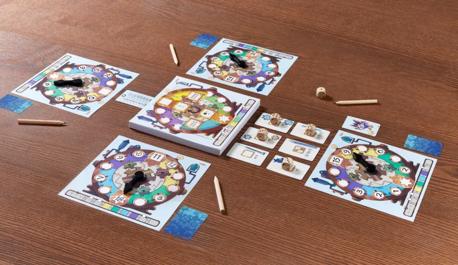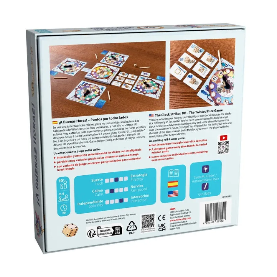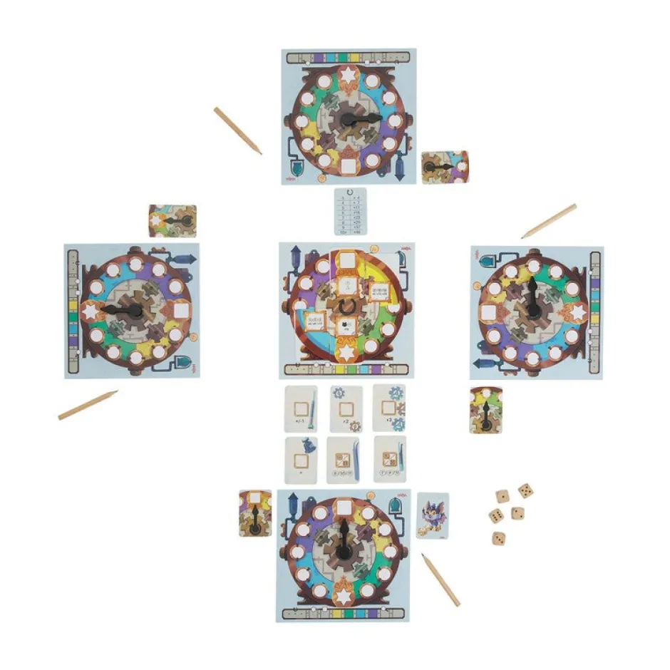Juego Roll&Write en el que cada jugador/a se convierte en fabricante de relojes especiales. En cada ronda se lanzan los dados y por turnos cada jugador usará uno de ellos en combinación con las operaciones de las cartas del centro para así añadir un número a su reloj. Después de 12 rondas, el relojero que mejor cumpla con los requisitos de sus clientes, logrará más puntos y ganará la partida.