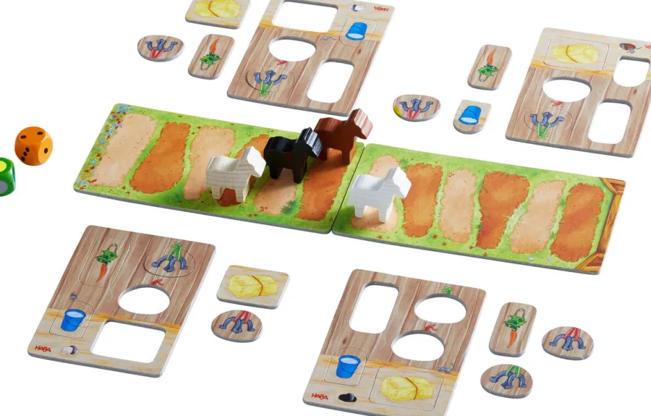 Por turnos lanzaremos 2 dados, uno que nos indicará cuantas casillas podemos avanzar y otro que nos dirá qué elemento (según su color) podemos dejar ya preparado en nuestro establo. Sin embargo en cada turno solo podemos hacer una de las dos acciones: elegir el dado numérico y avanzar o elegir el dado de colores y coger el elemento que necesitamos para que nuestro caballo descanse feliz.