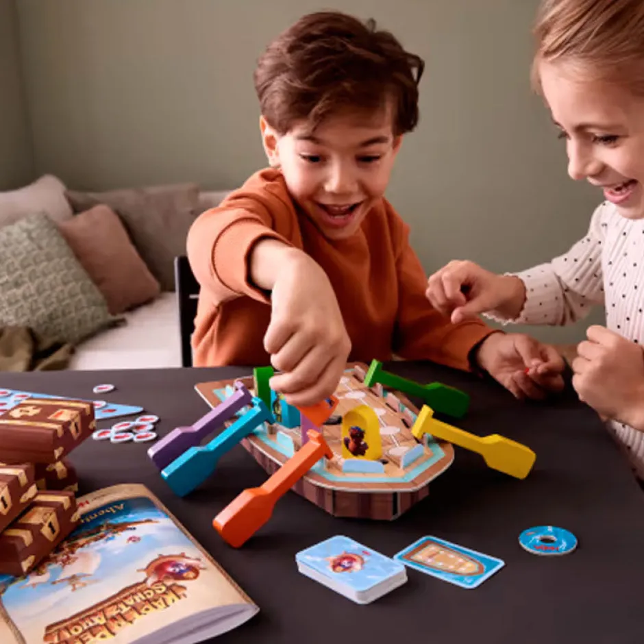 Contenido: 1 libro de aventuras, cuaderno de tesoros, barco formado por 2 piezas, mapa del tesoro, tablero de recompensas, 15 fichas de ala hacia arriba, 1 reloj de arena, 5 figuras de tripulación, 5 remos, 1 bola Capitán Pepe, 1 base para la bola, 1 sobre, 8 cofres con tesoros, cartas Legacy y 1 instrucciones del juego.