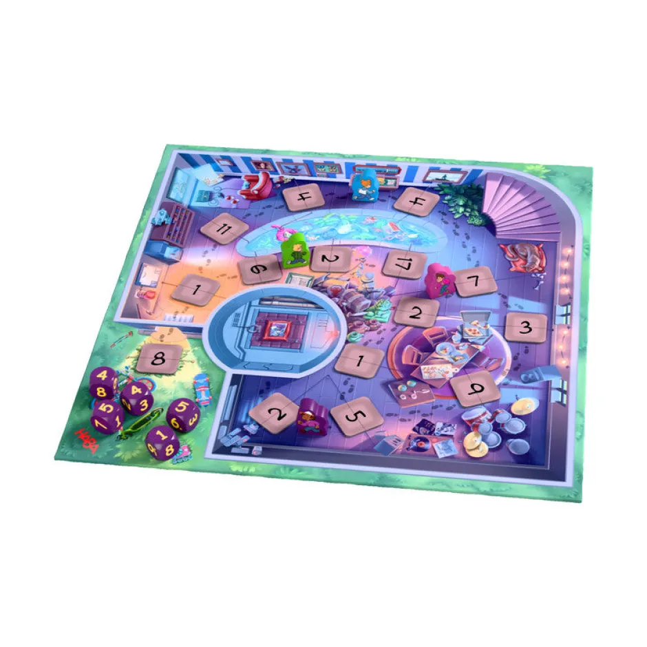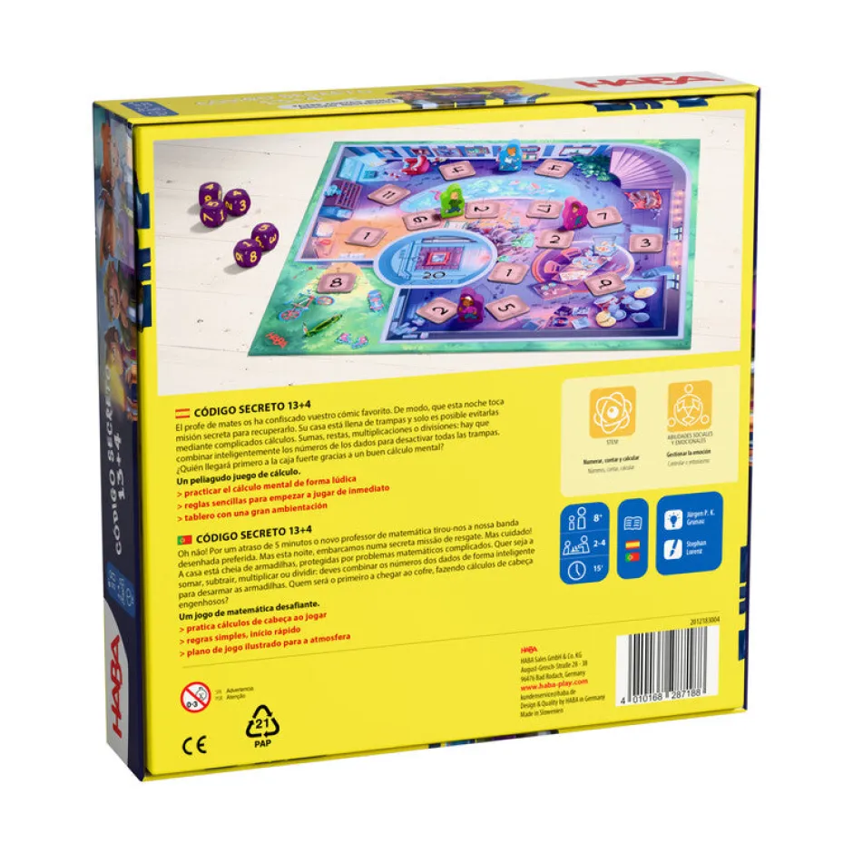 El clásico de HABA ahora renovado con una estupenda nueva imágen. Juego de cálculo en el que por turnos deberemos tirar los 6 dados y combinar el resultado obtenido ya sea sumando, restando, multiplicando o dividiendo, para así obtener los códigos que nos permitirán avanzar por la casa del profesor hasta alcanzar el cómic y recuperarlo. Permite distintas variantes de juego y distintos niveles de dificultad.