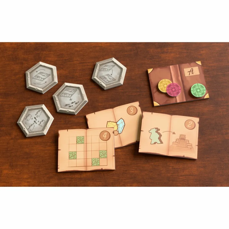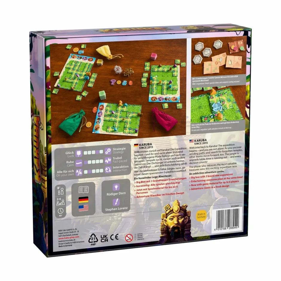 Bienvenidos/as de nuevo a Karuba! Comienza la expedición. Los equipos de exploración despejan rutas sinuosas, buscan templos olvidados y se enfrentan en una carrera codo con codo. La jungla es impredecible, el tiempo es apremiante… ¡y cada decisión cuenta! Quien consiga recuperar los tesoros más valiosos ganará esta emocionante expedición de competición.