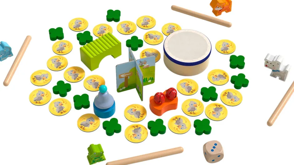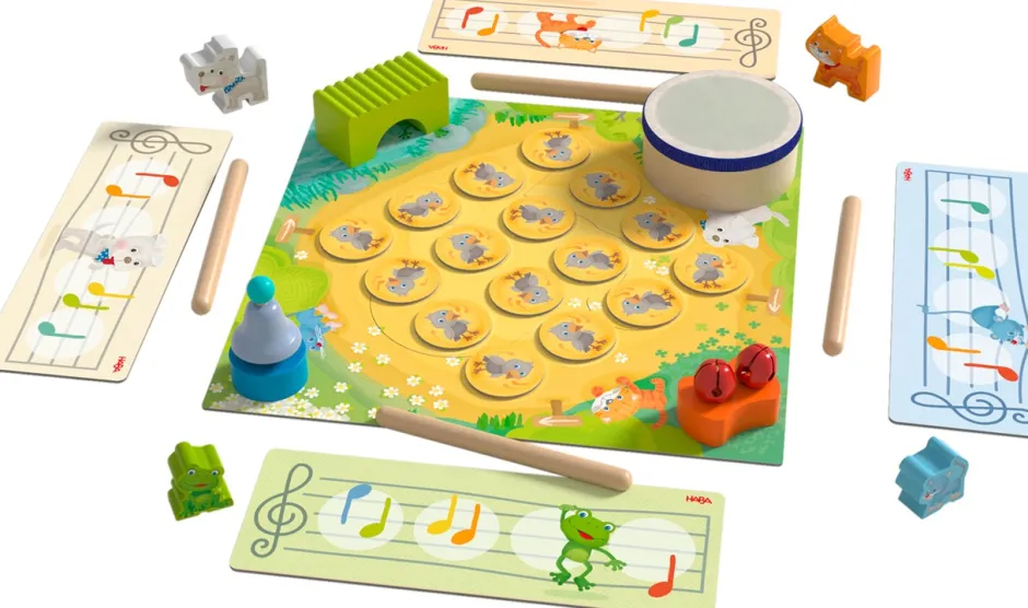 CONTENIDO: 1 tablero impreso por ambas caras (anverso «Camino Musical», reverso «Concierto de Animales»), 4 juguetes sonoros (tambor, sonajero, campana, abrazaderas), 5 varillas sonoras, 4 amigos (la ratita Rita, el perro Pedro, la rana Rania y la gata Gala), 12 tréboles, 4 cartones impresos a doble cara (anverso «Partitura», reverso «4 Amigos»), 24 fichas, 1 indicador (de 2 piezas, ensambladas), 1 dado, 1 instrucciones del juego.