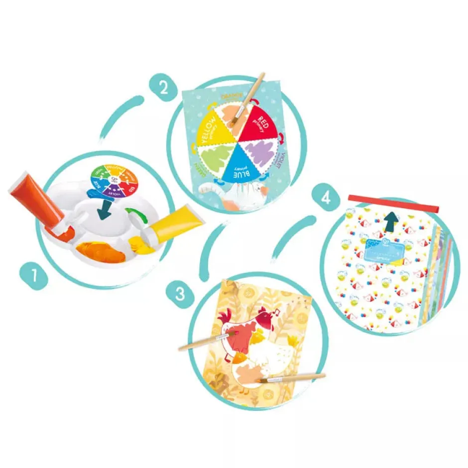 Contiene: 3 tubos de pintura de colores básicos, 2 pinceles, 1 porta láminas, 1 paleta para mezclar, 1 cuaderno con 6 láminas para pintar y una guía didáctica para aprender a mezclar y crear nuevos colores.