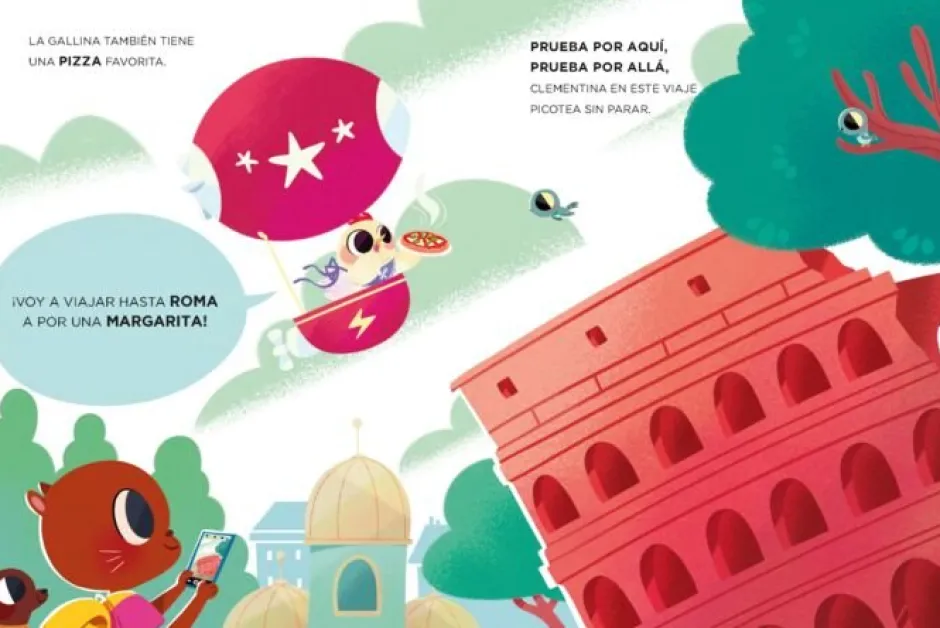 La gallina Clementina quiere preparar una cena espectacular para el cumpleaños de su pollito, pero necesita los mejores ingredientes. Para conseguirlos, sube a su zeppelín y recorre el mundo en busca de los platos más sabrosos. Desde una crujiente baguette en París hasta una deliciosa pizza en Roma, pasando por exóticas samosas en Bombay y refrescantes sorbetes en el Polo Sur, Clementina picotea y prueba de aquí y de allá, sin parar.