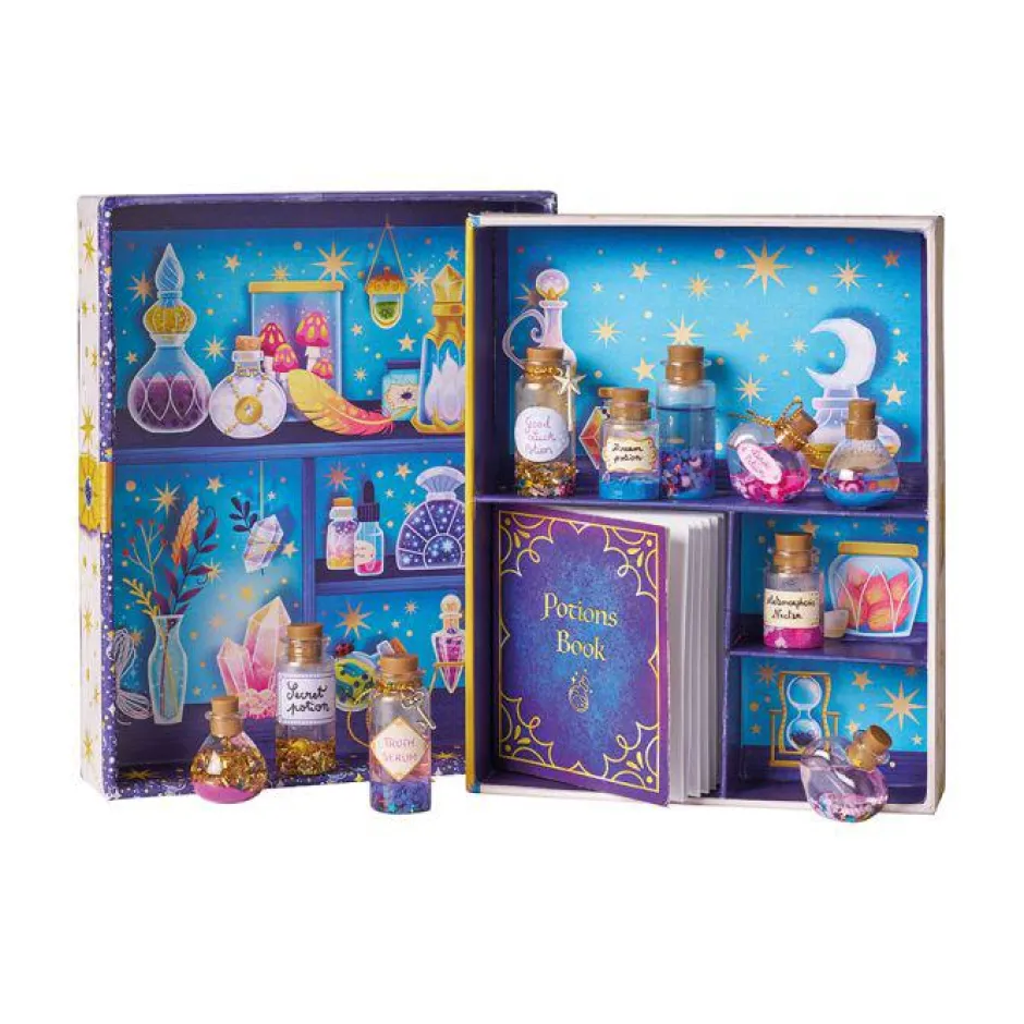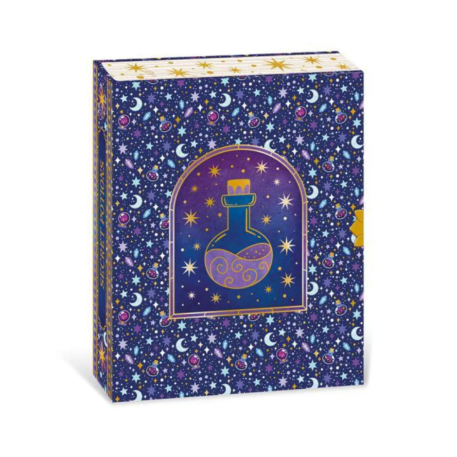 ¡Una pizca de estrellas, unas pocas lentejuelas y un toque de cuentas! ¡Esta caja creativa te permite hacer tus propias pociones mágicas en pequeños frascos usando una multitud de ingredientes y un libro de hechizos de recetas mágicas! Contiene 10 frascos de plástico con tapón, 2 tubos de arena, 20 cuentas acrílicas, 1 colgante de varita mágica, 1 varita de llave, 1 hilo dorado, 1 embudo, 2 bolsas de minibrillantes, 1 bolsa de palitos (3 modelos), 1 bolsa de estrellas, 1 bolsa de confeti metalizado, 1 lámina de pegatinas y 1 pequeño libro de hechizos con recetas. Esta actividad te permite desarrollar tu paciencia y creatividad y requiere aproximadamente 5 minutos por poción.