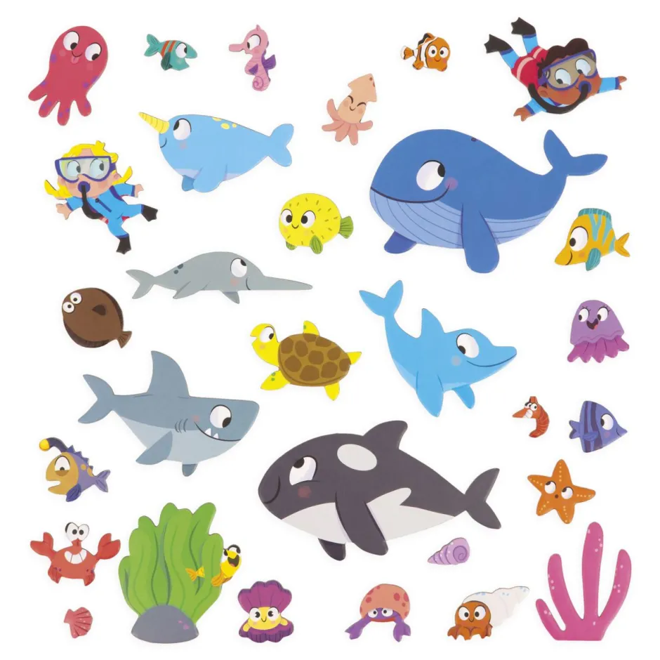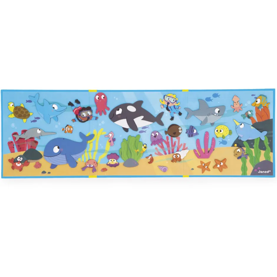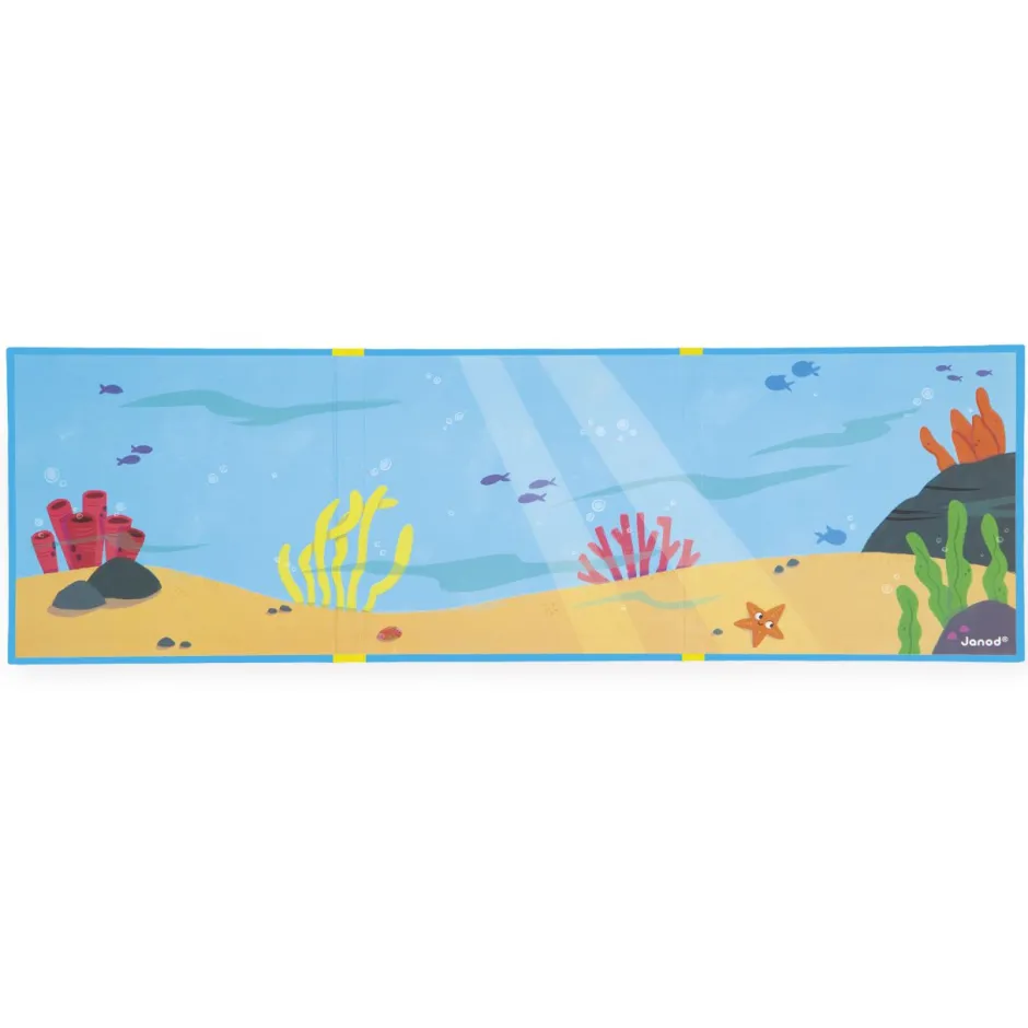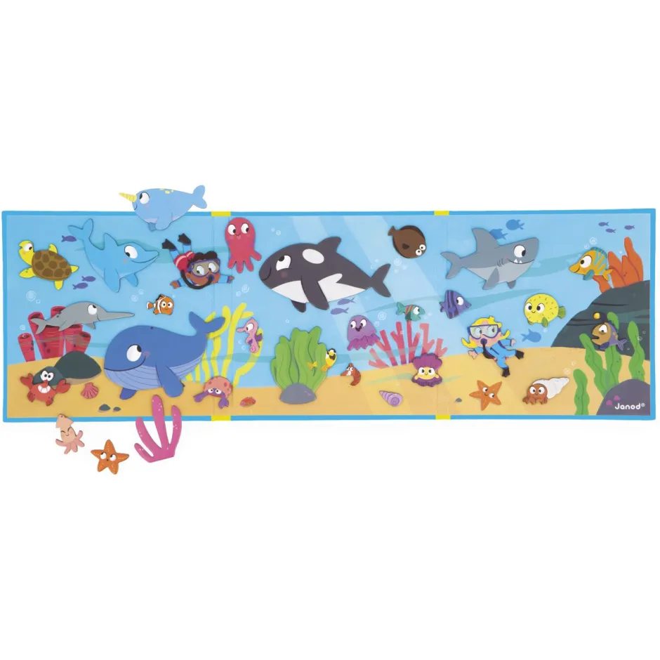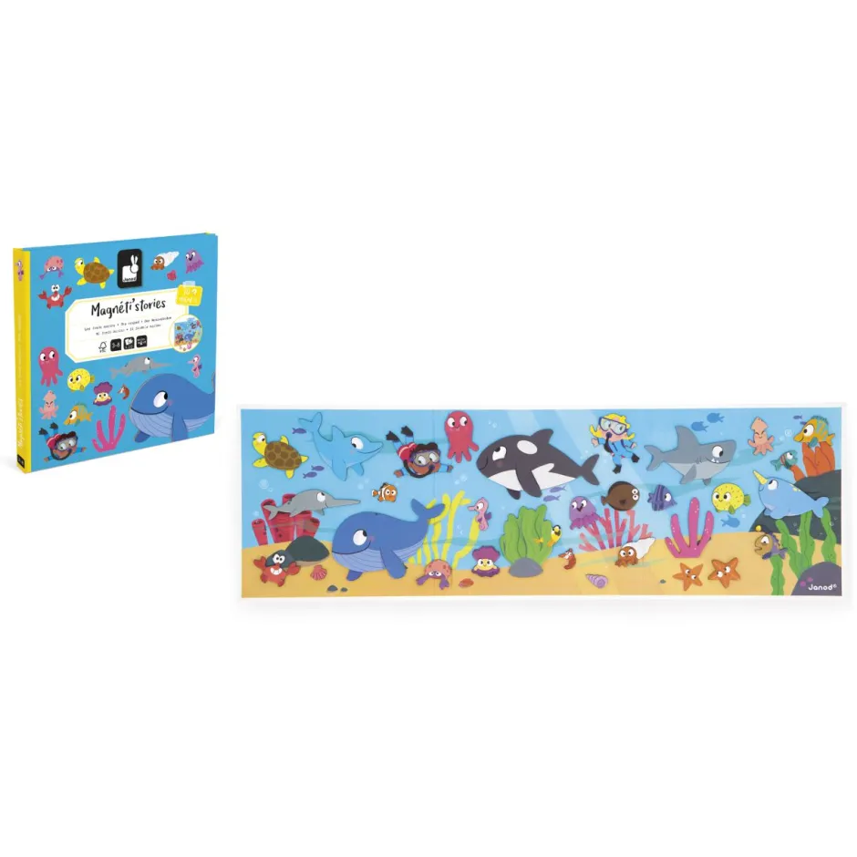 Gracias a la gran decoración magnética y a sus 30 imanes que representan peces y conchas, tu hijo podrá imaginar muchas historias en el mundo acuático.