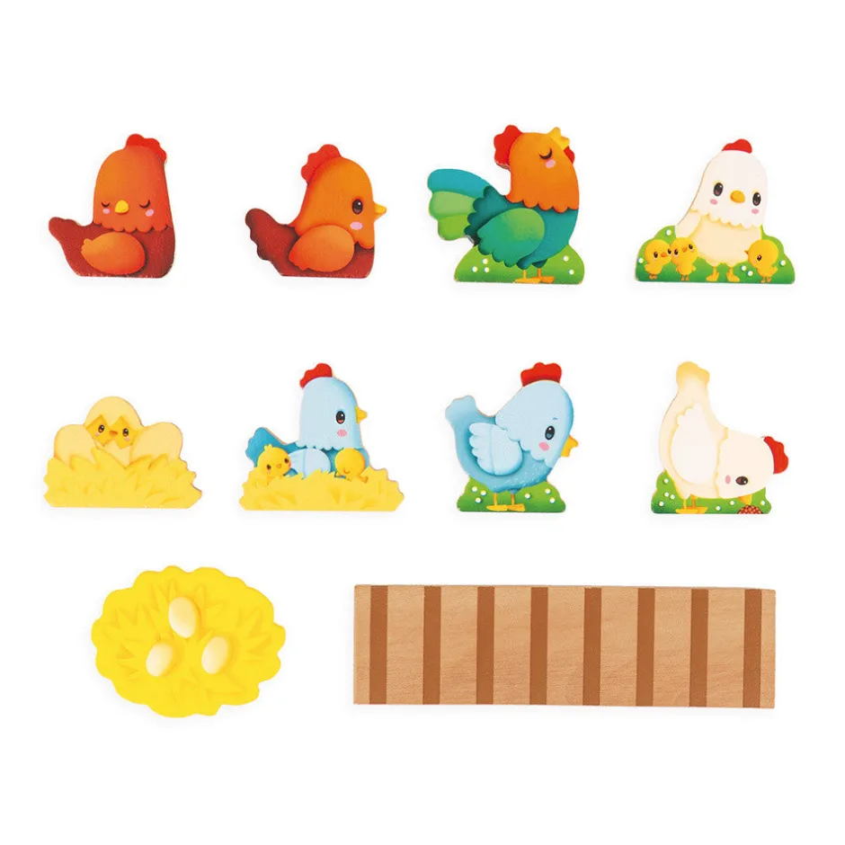 ¡Con este juguete de primera infancia, al bebé le esperan muchas aventuras en la granja! Anímale a encontrar a los pollitos, a colocar las figuras de madera en un lugar concreto del gallinero o incluso a describir lo que hace cada gallina para aprender aún más y pasar buenos ratos juntos.