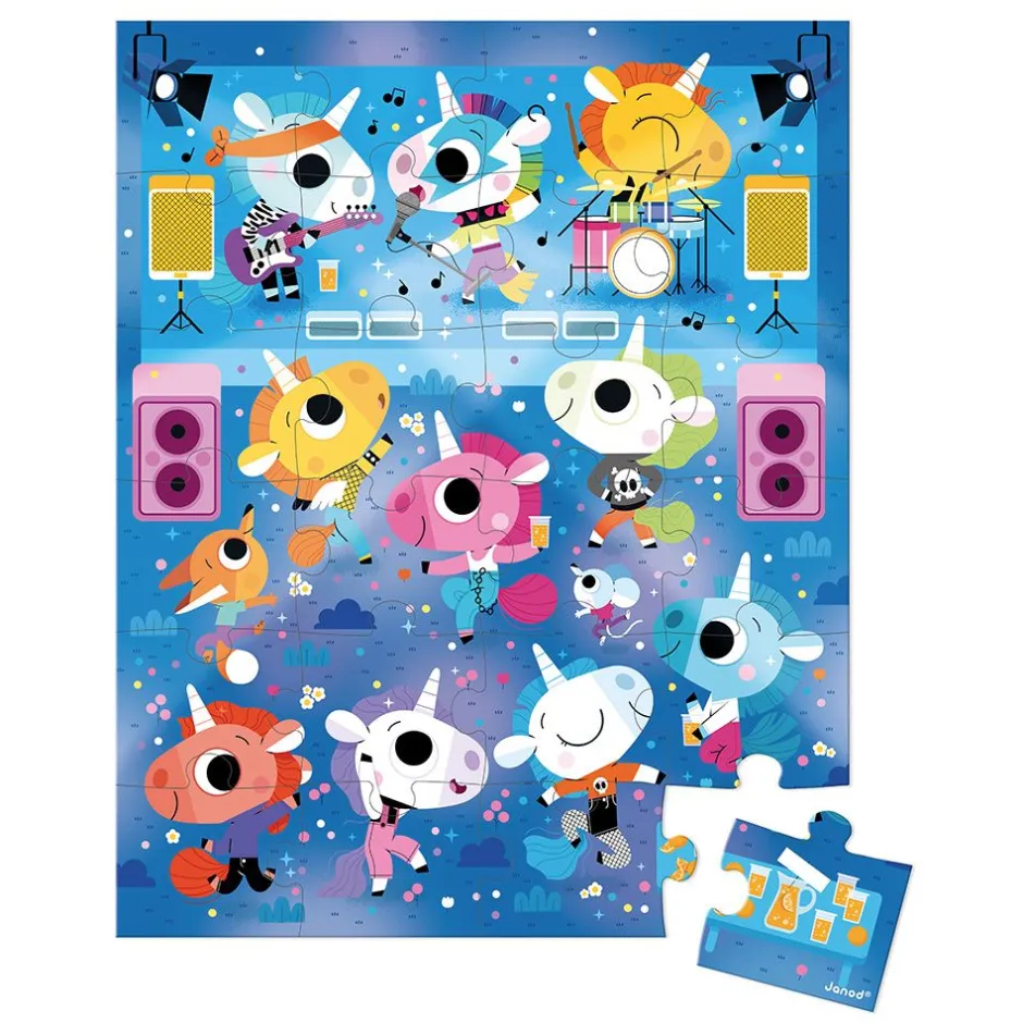 ¡Prepárate para seguir el ritmo con la cabeza! ¡Este puzle de 24 piezas te invita a un fabuloso concierto de rock a cargo de un grupo de unicornios! Los niños a partir de 3 años están listos para sumergirse en un universo musical y mágico.