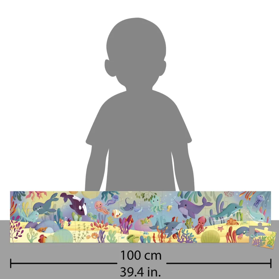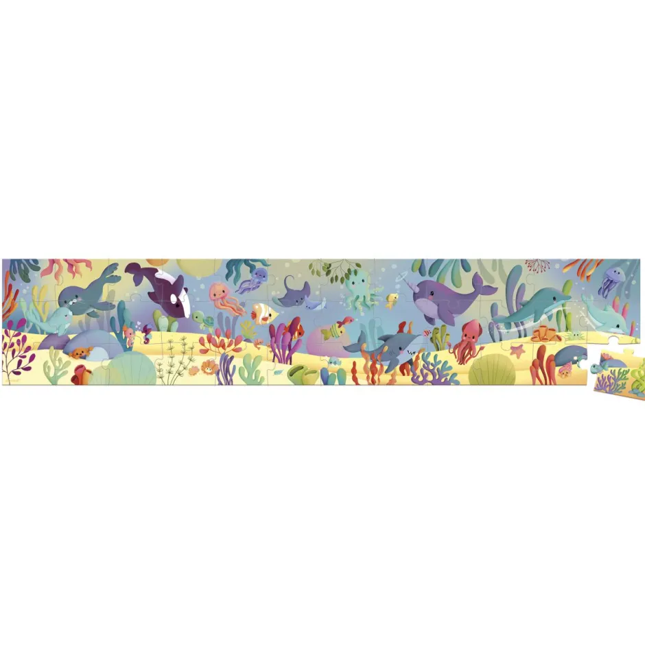 ¡Descubre las profundidades del océano! Sumérgete en busca de los animales marinos con este friso ilustrado de 36 piezas sobre el tema de las criaturas marinas, adecuado para niños a partir de 4 años. Este puzzle panorámico de 100 x 20 cm ofrece una inmersión total en las profundidades del mar. Las piezas se adaptan perfectamente a las pequeñas manos de los niños de 4 años, ayudándoles a desarrollar su motricidad fina y su lógica.