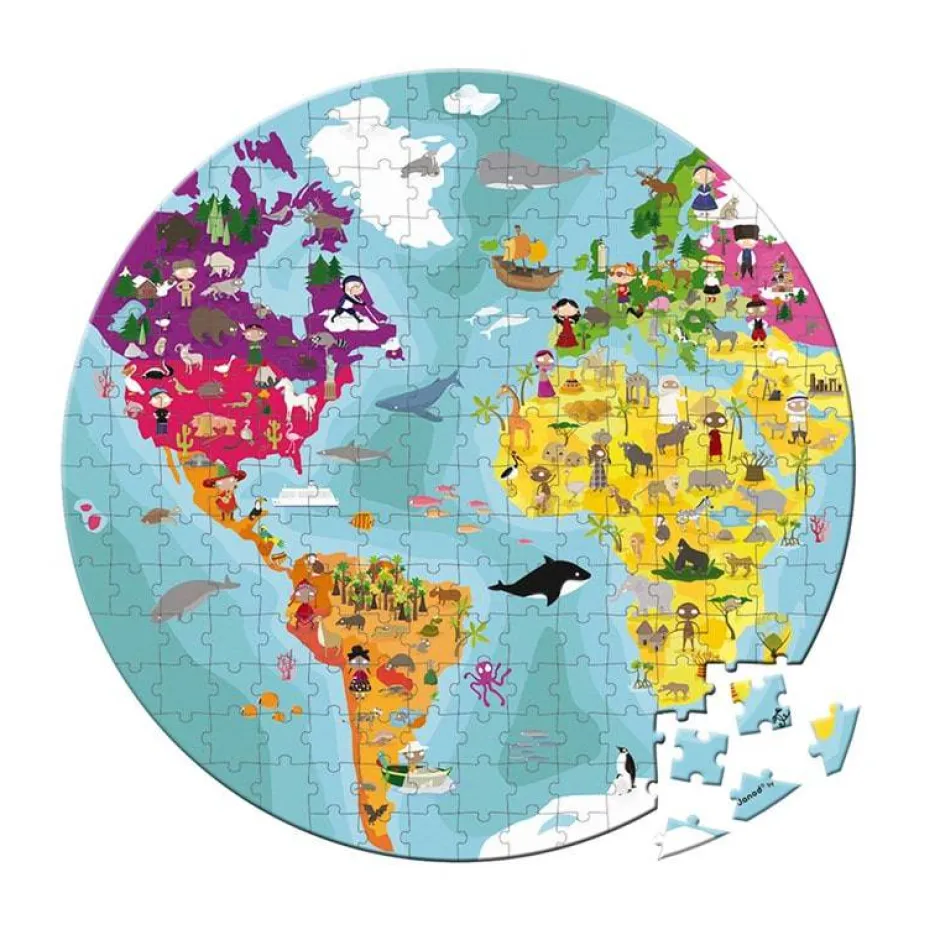 Puzle con piezas de cartón ilustradas a dos caras sobre el tópico planeta Tierra. Ideal para aprender geografía y descubrir la cultura de los diferentes países. Ilustrado con las personas y los animales típicos de cada uno de los continentes.