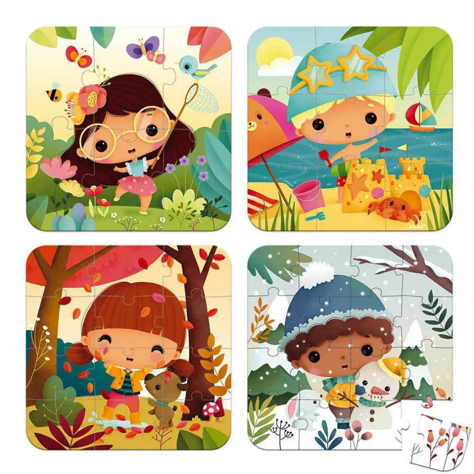 4 puzles evolutivos de cartón de 6, 9, 12 y 16 piezas con la temática de las 4 estaciones. Se venden en una bonita caja de regalo.