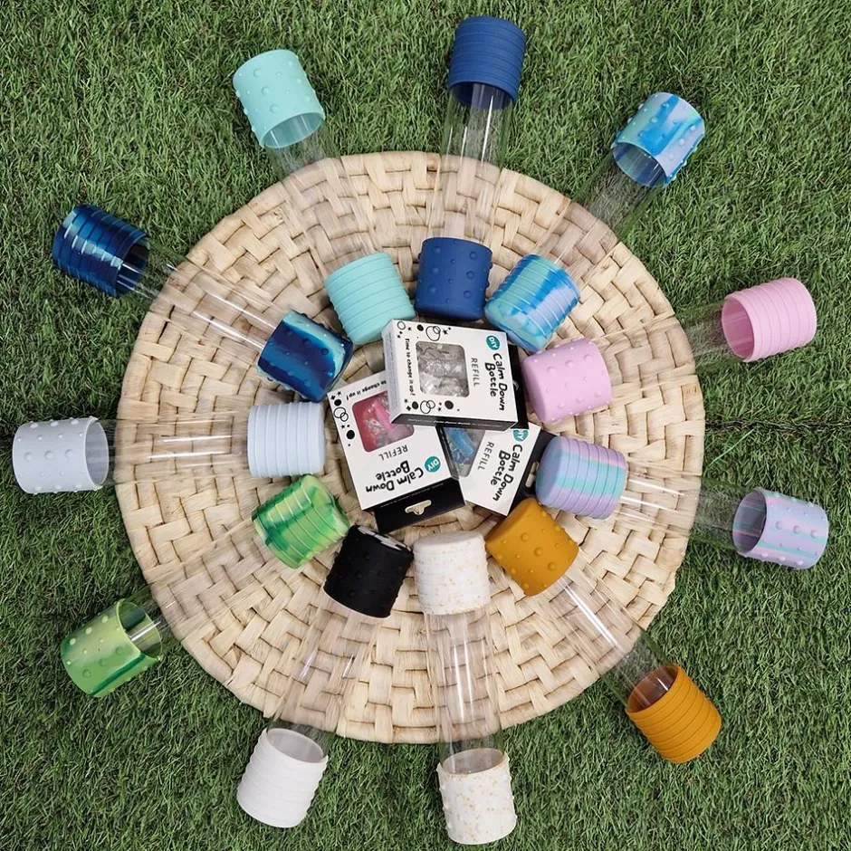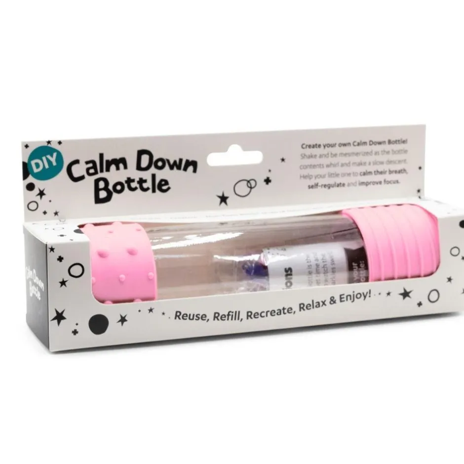 La galardonada botella DIY Calm Down es una botella sensorial única, en la que recibe todos los elementos creativos necesarios para crear una botella sensorial perfecta para su hijo. ¡Simplemente agregue agua tibia y una pizca de detergente líquido y estará listo para usar! Con esta opción, puede rellenar y reutilizar la botella sensorial para disfrutar de infinitas opciones creativas.