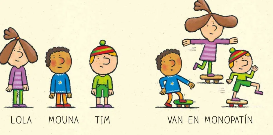 Niñas y niños de distintas edades y culturas -un guiño a la diversidad- se desplazan en medios de locomoción individuales y colectivos tanto para jugar como para llegar a otros lugares: monopatín, bicicleta, automóvil…