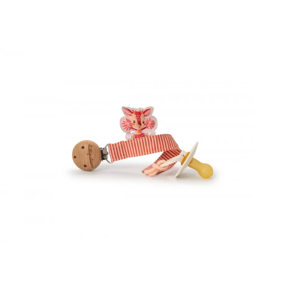 Este alegre sujetador de chupete mantiene el chupete al alcance de tu pequeño. Hecho de algodón orgánico y madera certificada por FSC