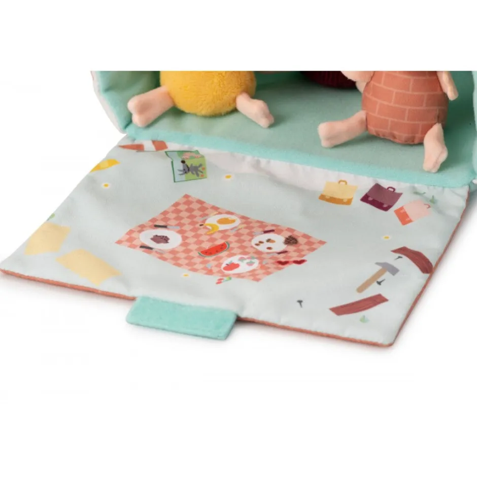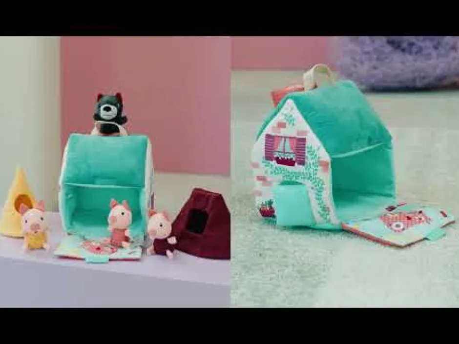 Este juguete de tela, inspirado en el cuento del lobo y los tres cerditos, incluye 4 personajes, 2 casitas que representan las casas de paja y madera, y una tercera casa que representa la casa de ladrillos. La casa de ladrillos tiene una chimenea por donde el lobo puede deslizarse, así como una pared que se abre. Estimulando la imaginación, este juguete fomenta el juego creativo y desarrolla habilidades motoras finas.