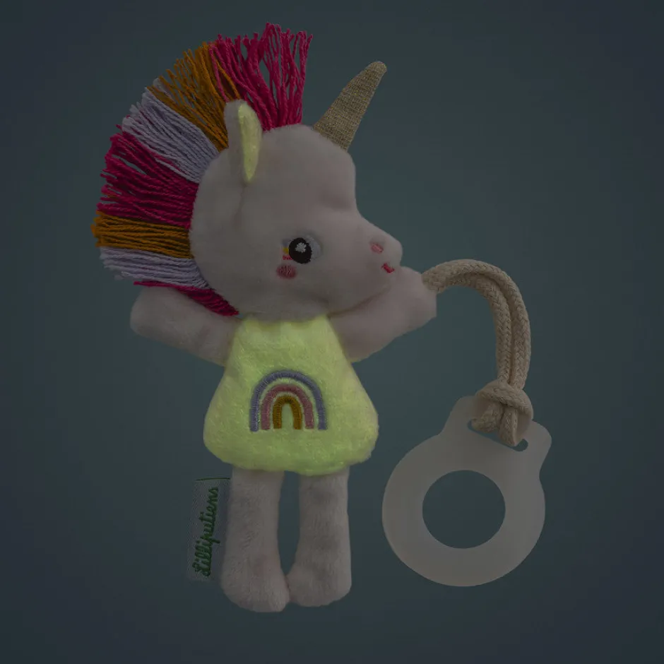 ¡Buenas noches, pequeña Lena! Con este pequeño peluche, se acabaron los chupetes perdidos en medio de la noche. Gracias a este bonito unicornio que brilla en la oscuridad, usted o su bebé no tendrán problemas para encontrar lo esencial, incluso en la oscuridad: chupete, peluche… Más que un clip para chupete, este peluche de unicornio también se puede usar como un peluche para tranquilizar al bebé durante todo el día. También es una extensión que le permite agarrar su chupete con mayor facilidad. Y cuando llega la noche, su pequeño vientre redondo y sus orejas brillan con un brillo suave y relajante. En su tamaño compacto de 8 x 14 cm, este unicornio de peluche es un concentrado de suavidad con tonos rosados y una bonita melena. Su cierre de silicona es seguro para los más pequeños, desde el nacimiento. ¡Es el pequeño accesorio dulce e inteligente que necesitas, o que complacerá a los padres, para noches más tranquilas! Puedes lavar el peluche Lilliputiens que brilla en la oscuridad en la lavadora a 30°. ¡Es hora de dulces sueños!