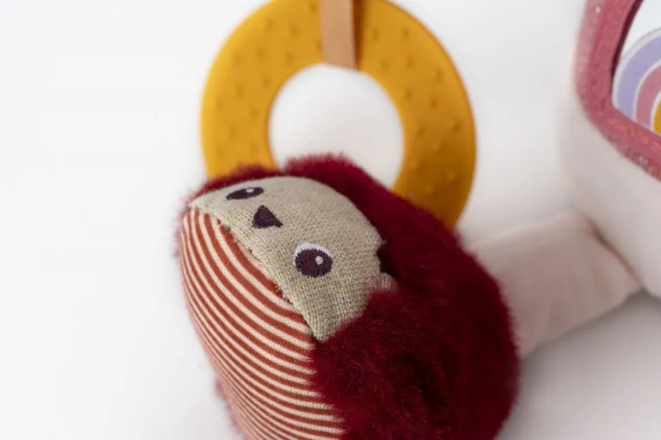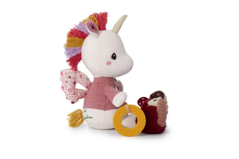 Lena la unicornio ofrece una multitud de actividades para despertar los sentidos de los más pequeños. Equipada con un anillo de dentición suave, un espejo cubierto con un arcoíris y una melena peluda multicolor, este compañero mágico está lleno de sorpresas.