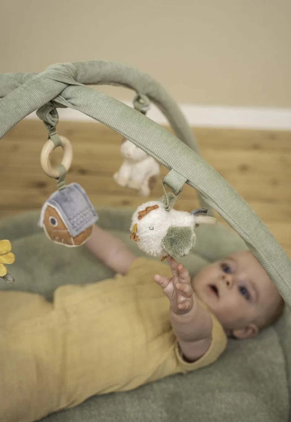 Fomenta la exploración. Desafiará a tu pequeño a moverse, alcanzar y agarrar con esta alfombra de actividades cautivadora. La alfombra es super suave, tiene forma redondeada en la base con un grosor de 2 cm, lo que la hace muy confortable y está inspirada en la estética de la granja de la colección Little Farm, con 5 diferentes suaves juguetes colgantes que mantendrán a su bebé entretenido y desarrollará la coordinación ojo-mano.