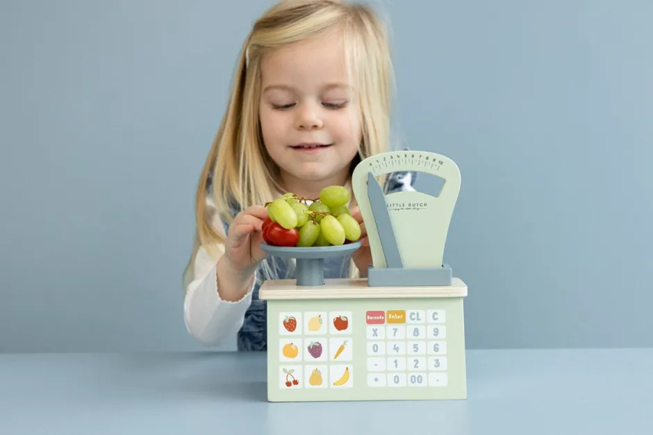 Imagina tener tu propia tienda de frutas y verduras, métete en el papel con esta adorable balanza. Comprueba el peso y calcula el precio total para informar al cliente. O utiliza la balanza para jugar en la cocina a pesar los ingredientes de tus recetas favoritas.