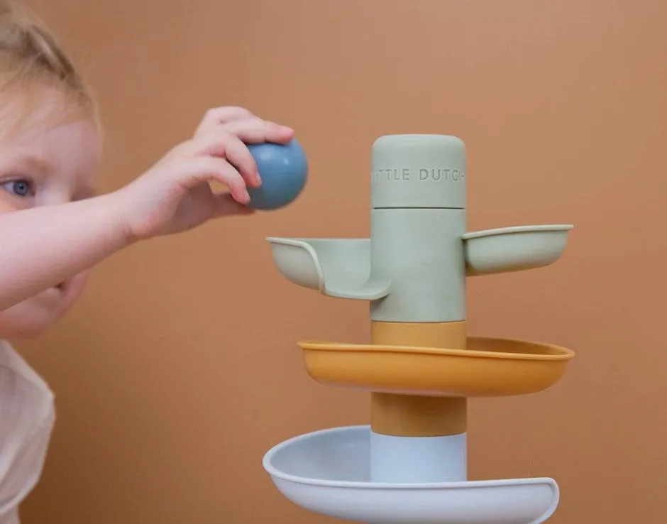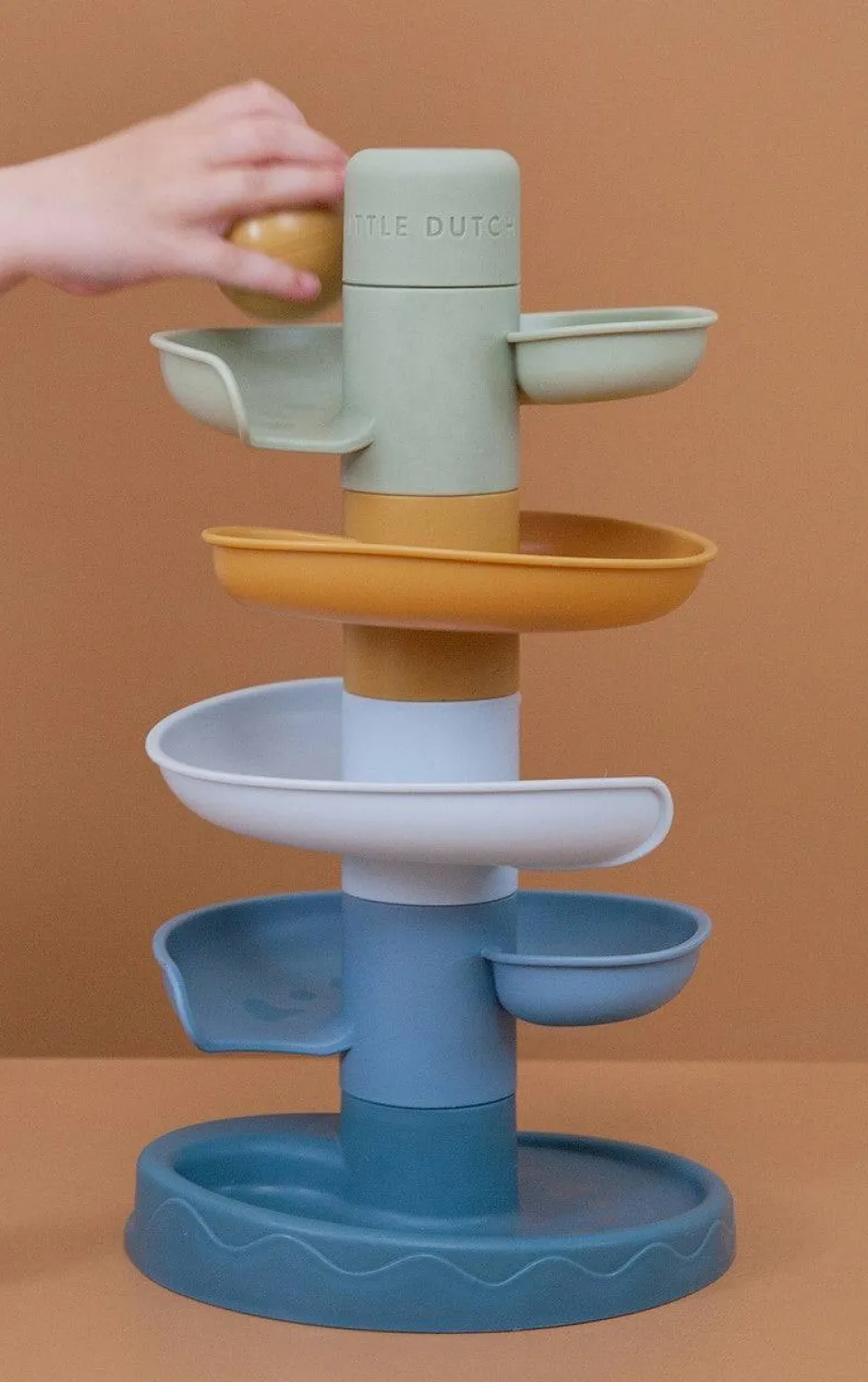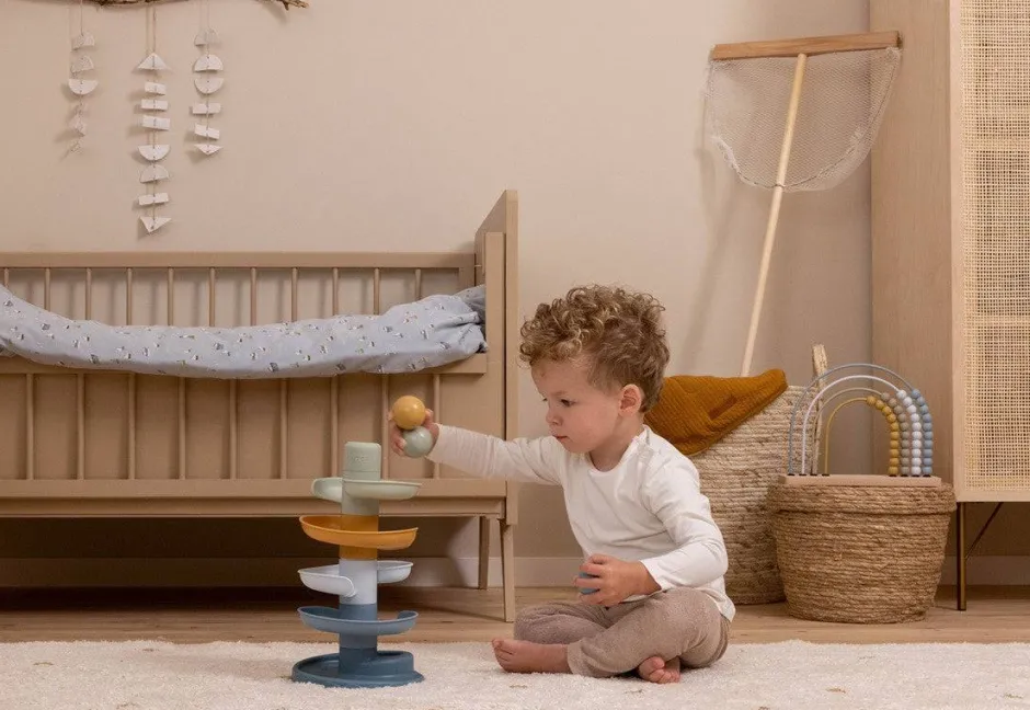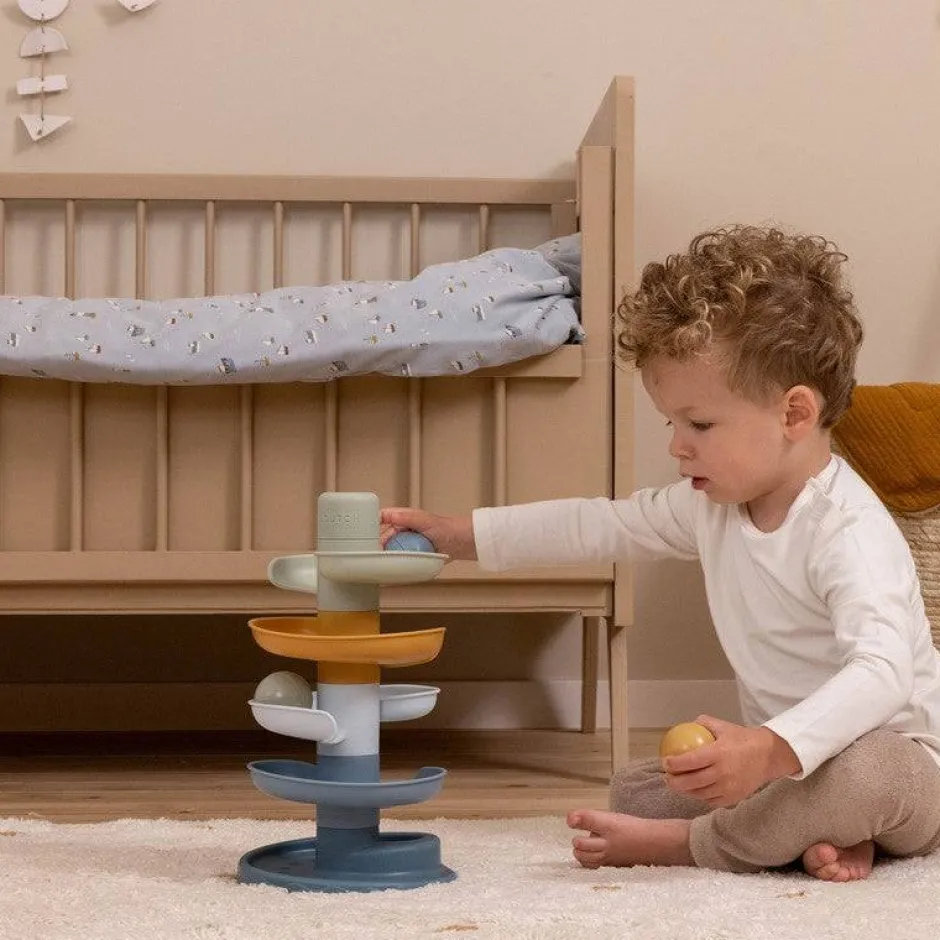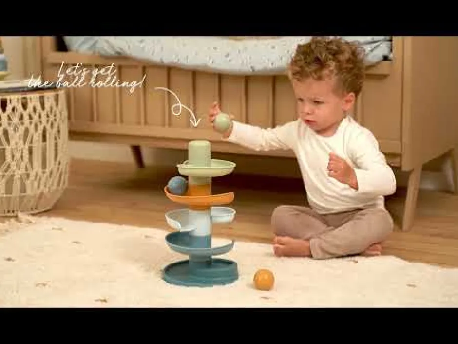 El colorido juguete consta de 5 piezas de tonos suaves que su pequeño puede apilar fácilmente. Deje caer las bolas una por una en el nivel superior y vea cómo cada una de ellas se enrolla y rueda hacia abajo.
