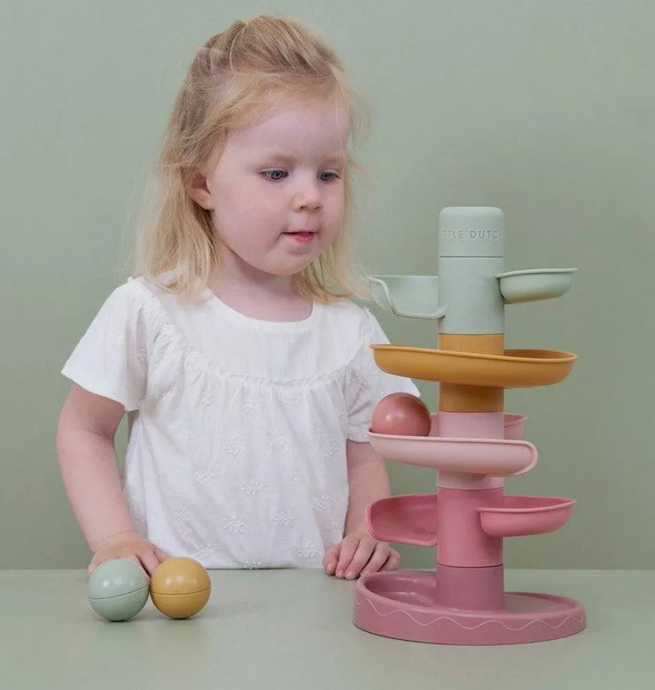 El colorido juguete consta de 5 piezas de tonos suaves que su pequeño puede apilar fácilmente. Deje caer las bolas una por una en el nivel superior y vea cómo cada una de ellas se enrolla y rueda hacia abajo.