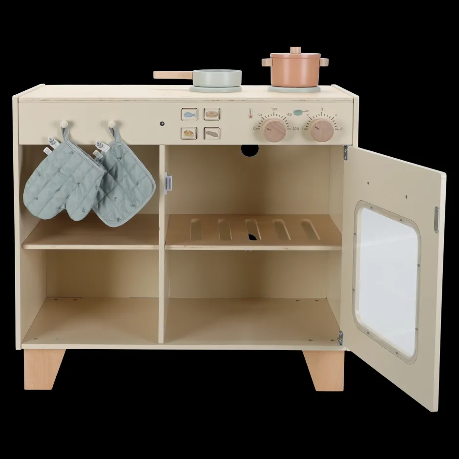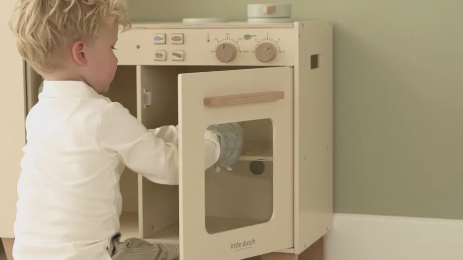 ¡Atención, pequeños chefs! Esta preciosa estación de cocina de madera es perfecta para preparar las comidas más deliciosas. Hornee un pastel o cocine verduras frescas en el horno. El set incluye dos sartenes, una manopla y un paño, y está equipado con botones con ilustraciones para mayor realismo. Combine la cocina con el refrigerador o el set de lavadora y lavavajillas para crear una cocina de juguete completa. ¿Qué hay en el menú de hoy?