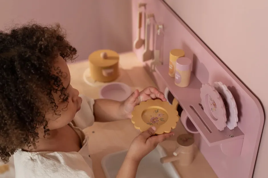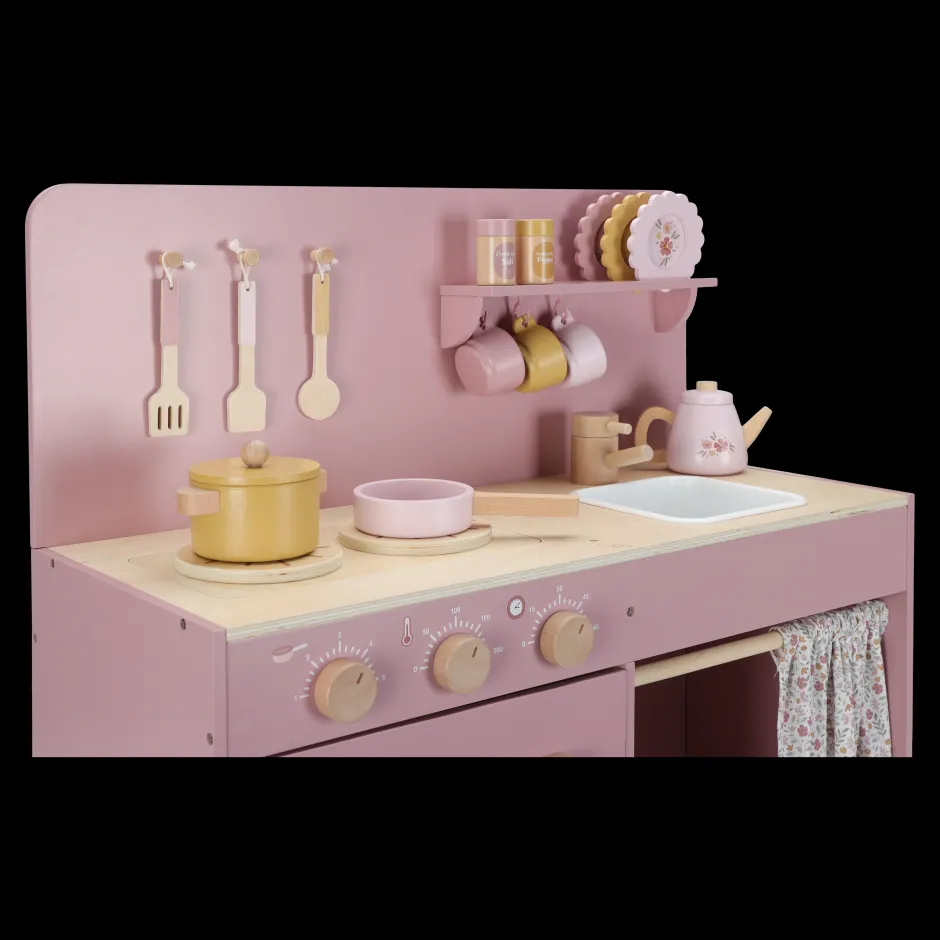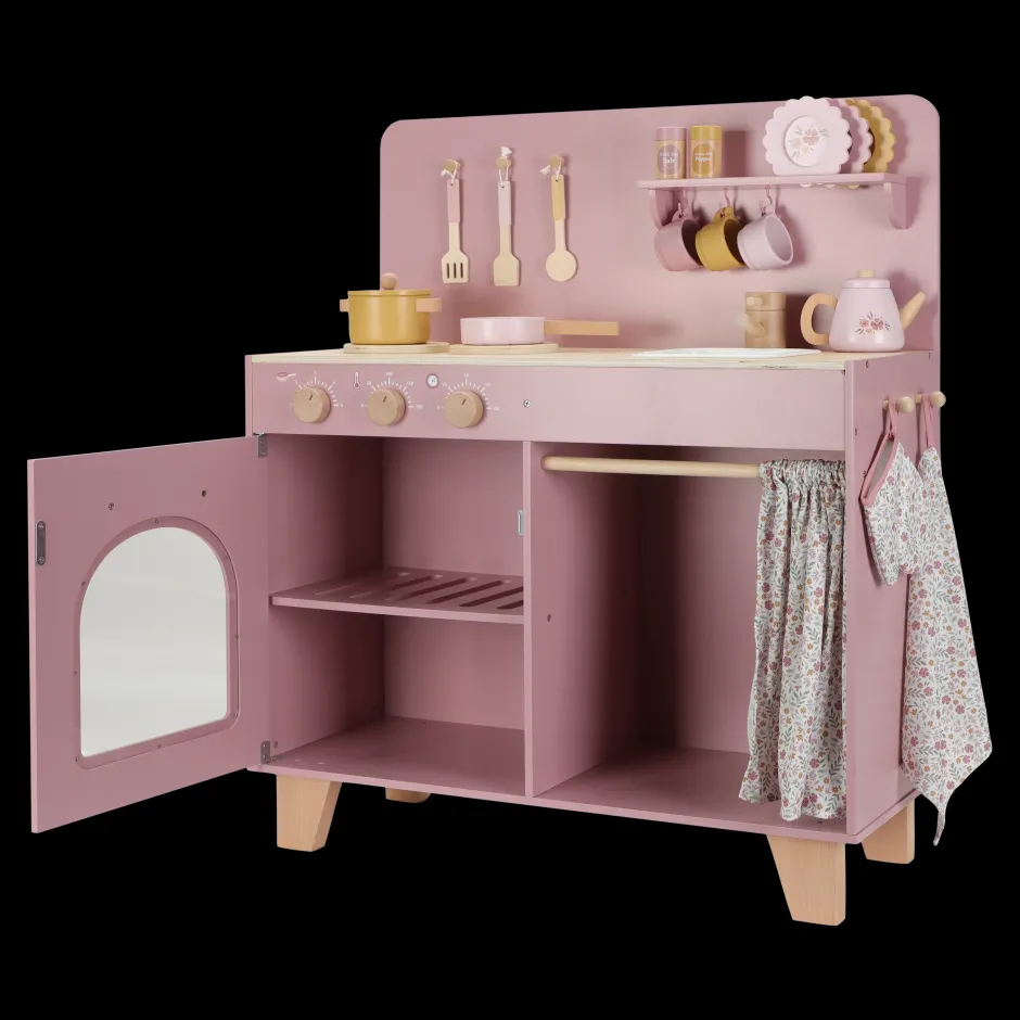 ¡Pequeños chefs, preparados para guisar unas deliciosas comiditas! Con esta cocina de juguete rosa de madera, podrán sumergirse en el mundo de la cocina y la repostería. El set incluye dos sartenes, utensilios de cocina, tres tazas y tres platos, todos con alegres ilustraciones. Horneen un pastel en el horno o cocinen verduras en los fuegos, que produce un sonido burbujeante al colocar una sartén sobre ella. Lávense las manos en el fregadero y guarden la compra en la alacena. El microondas tiene botones reales con ilustraciones, y con el juego de sal y pimienta, podrán darle un toque especial a cada plato. La cortina de tela, el paño de cocina y la manopla de horno están decorados con el suave estampado de flores suaves. ¡Una encantadora cocina de juguete para una diversión sin fin cocinando!