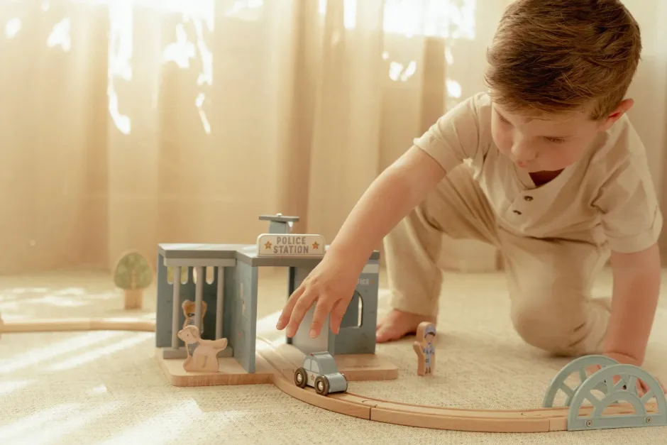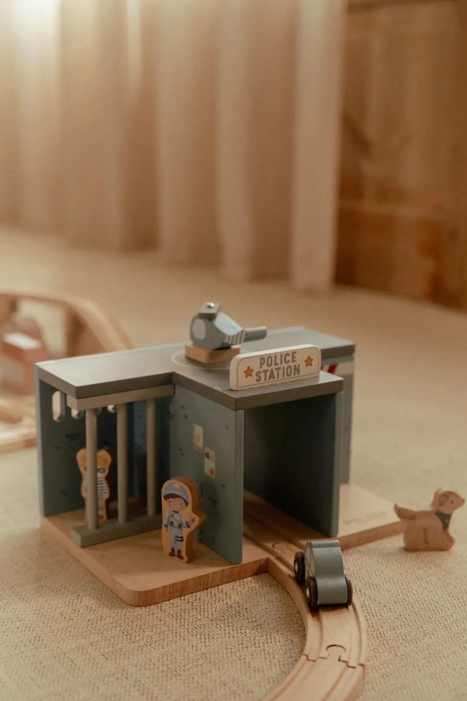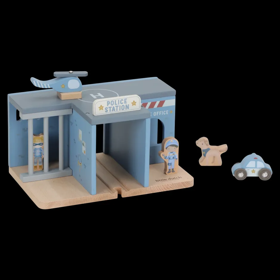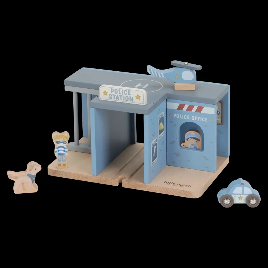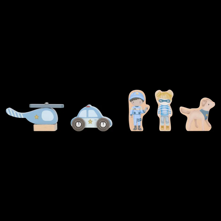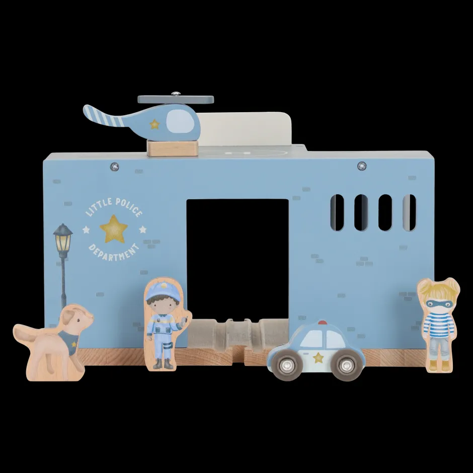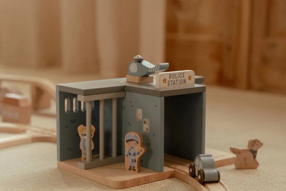 ¡Ladrón descubierto! Esta comisaría de madera lo tiene todo para crear emocionantes historias policiales. Incluye un coche patrulla, un helicóptero, un agente, un ladrón e incluso un perro policía. La comisaría cuenta con una celda con barrotes y una plataforma de aterrizaje. Encierra al ladrón y mantén la ciudad a salvo. Este juguete de comisaría es el complemento perfecto para la vía del tren de madera XL y fomenta el juego imaginativo. ¿A quién llevarás a la comisaría?